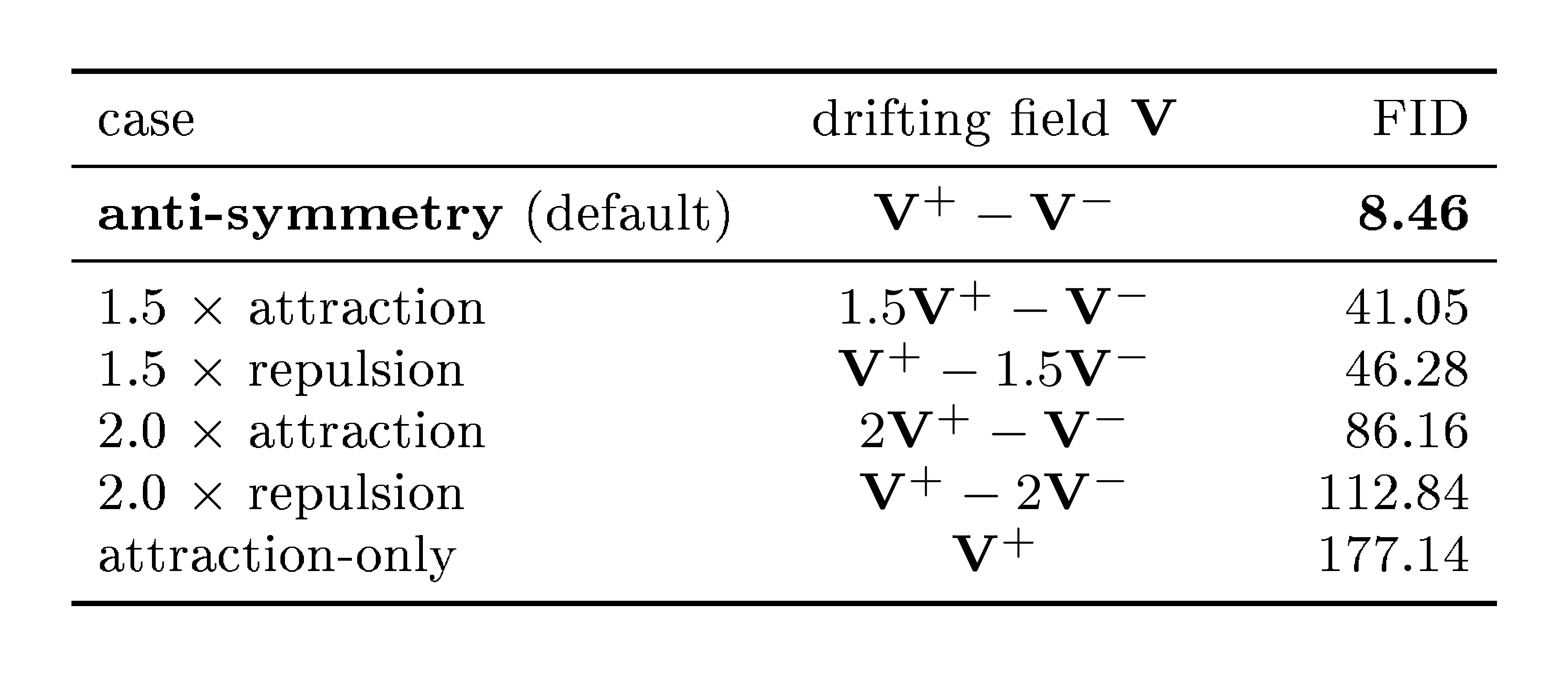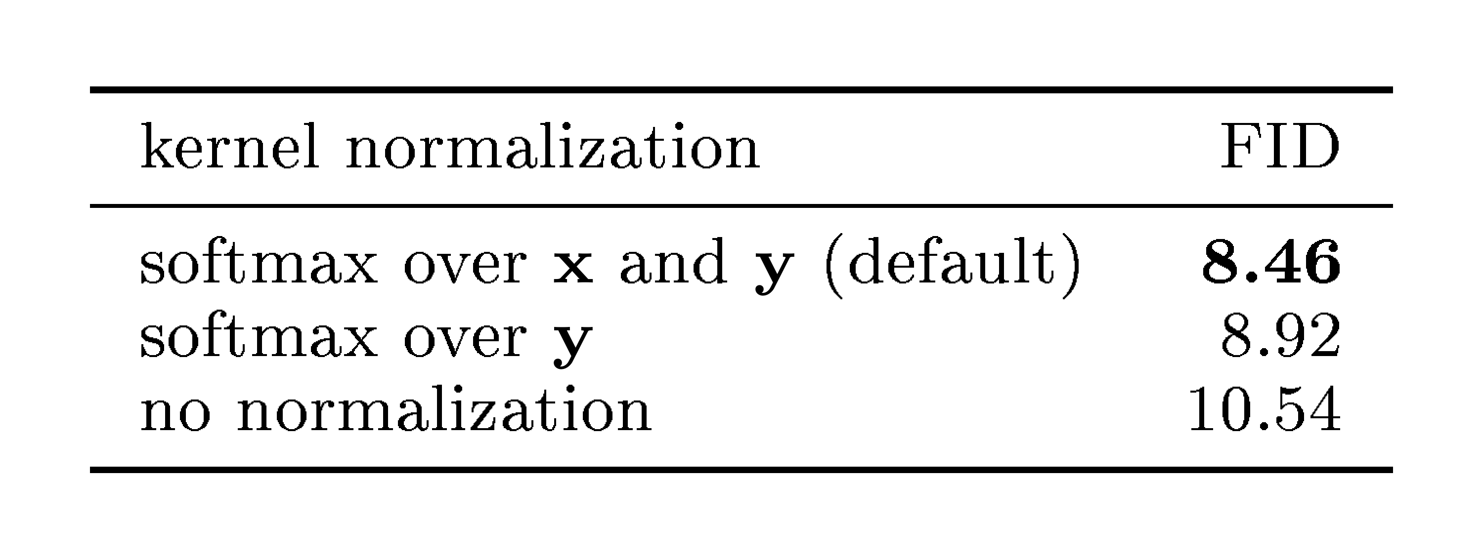 In practice, we implement $\tilde{k}$ using a softmax operation, with logits given by $-\frac{1}{\tau} | \mathbf{x} - \mathbf{y}|$, where the softmax is taken over $\mathbf{y}$. This softmax operation is similar to that of InfoNCE [26] in contrastive learning. In our implementation, we further apply an extra softmax normalization over the set of ${\mathbf{x}}$ within a batch, which slightly improves performance in practice. This additional normalization does not alter the antisymmetric property of the resulting $\mathbf{V}$.