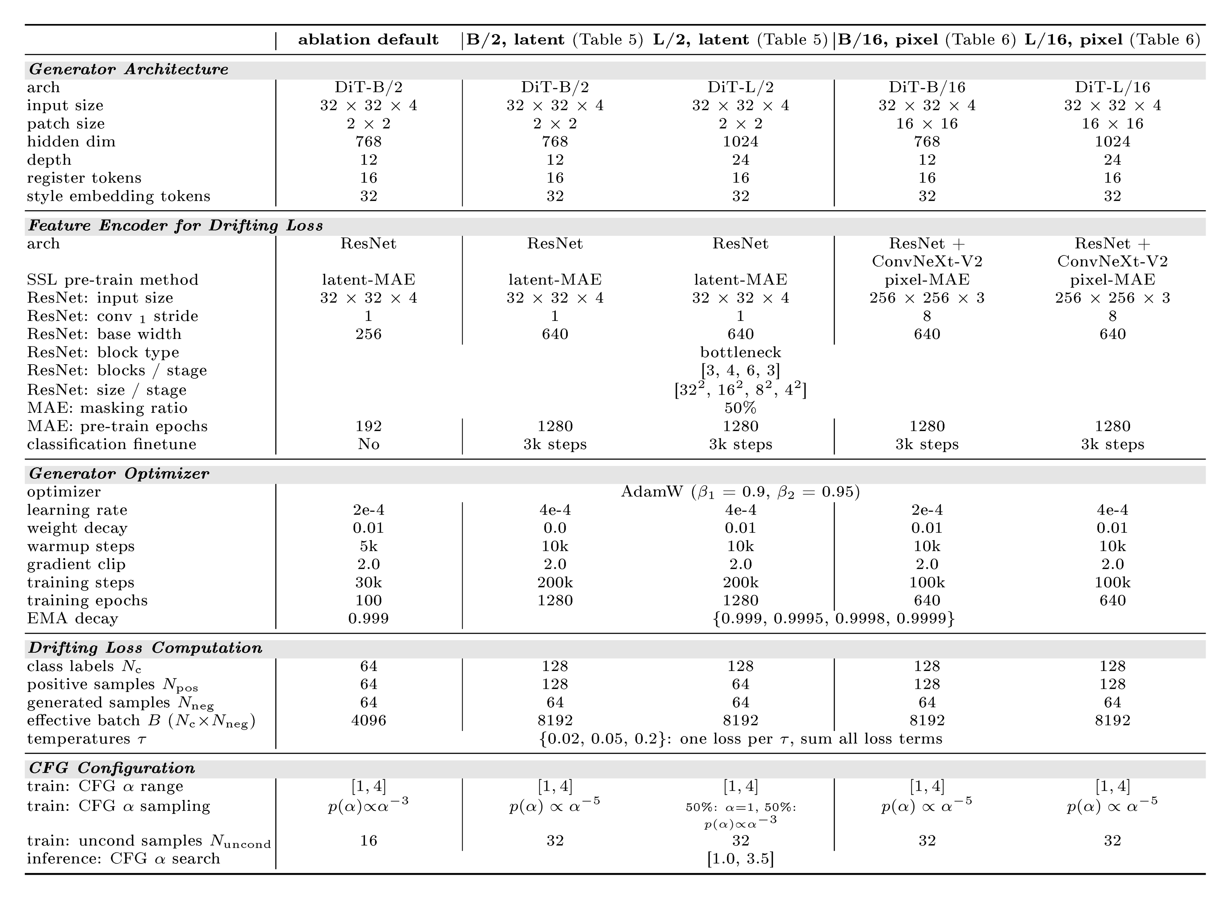 Here, $\phi_j$ represents the feature vectors at the $j$-th scale and/or location from an encoder $\phi$. With a ResNet-style image encoder [33], we compute drifting losses across multiple scales and locations, which provides richer gradient information for training.