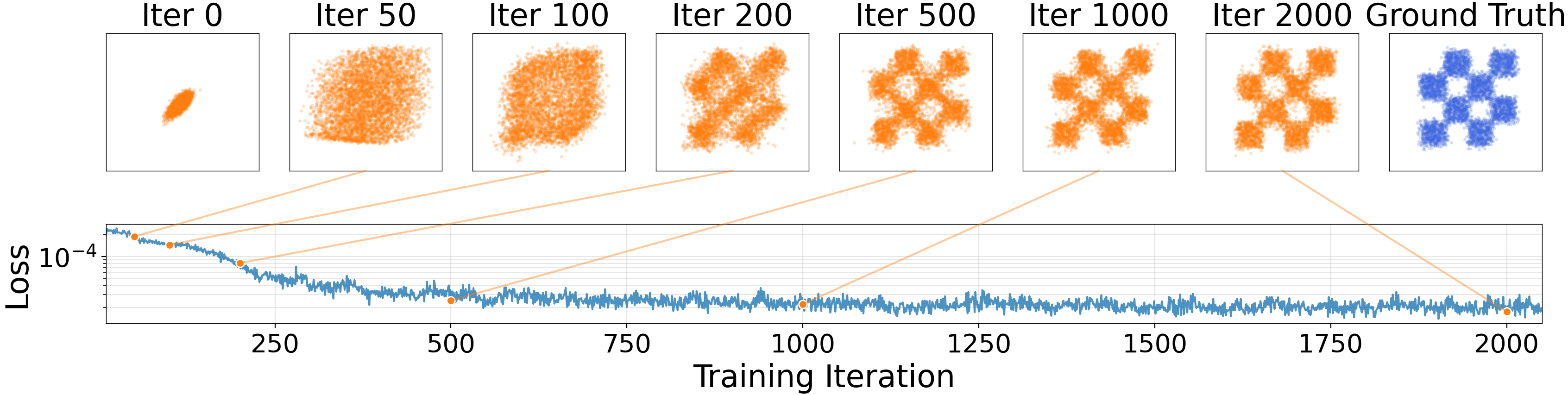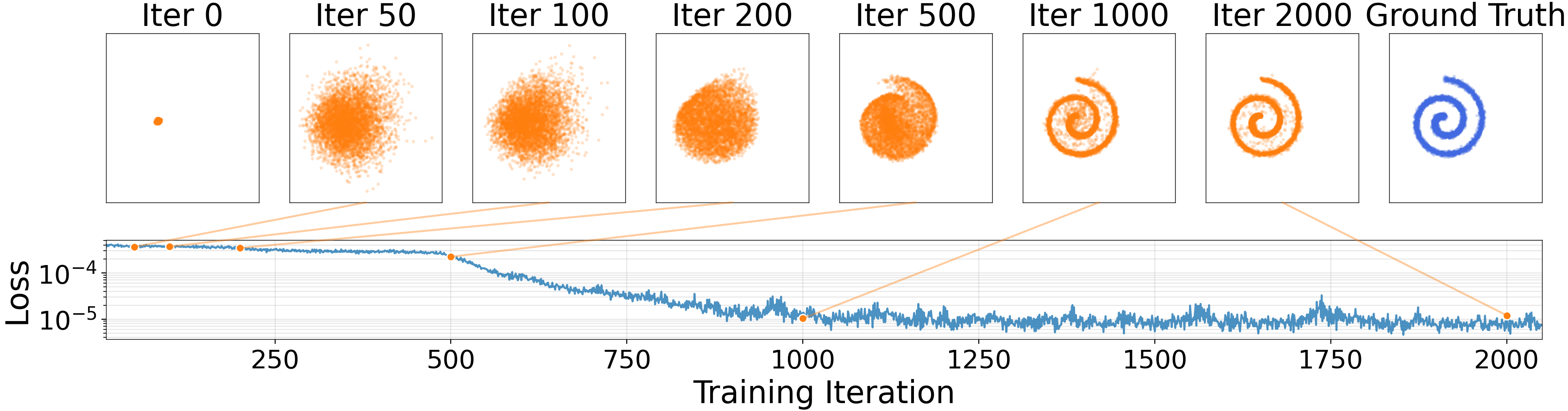 Since neural network training is inherently iterative (e.g., SGD), the training process produces a sequence of models ${f_i}$, where $i$ denotes the training iteration. This corresponds to a sequence of pushforward distributions ${q_i}$ during training, where $q_i = [f_i] {#}p{{\boldsymbol{\epsilon}}}$ for each $i$. The training process progressively evolves $q_i$ to match $p_{\text{data}}$.
