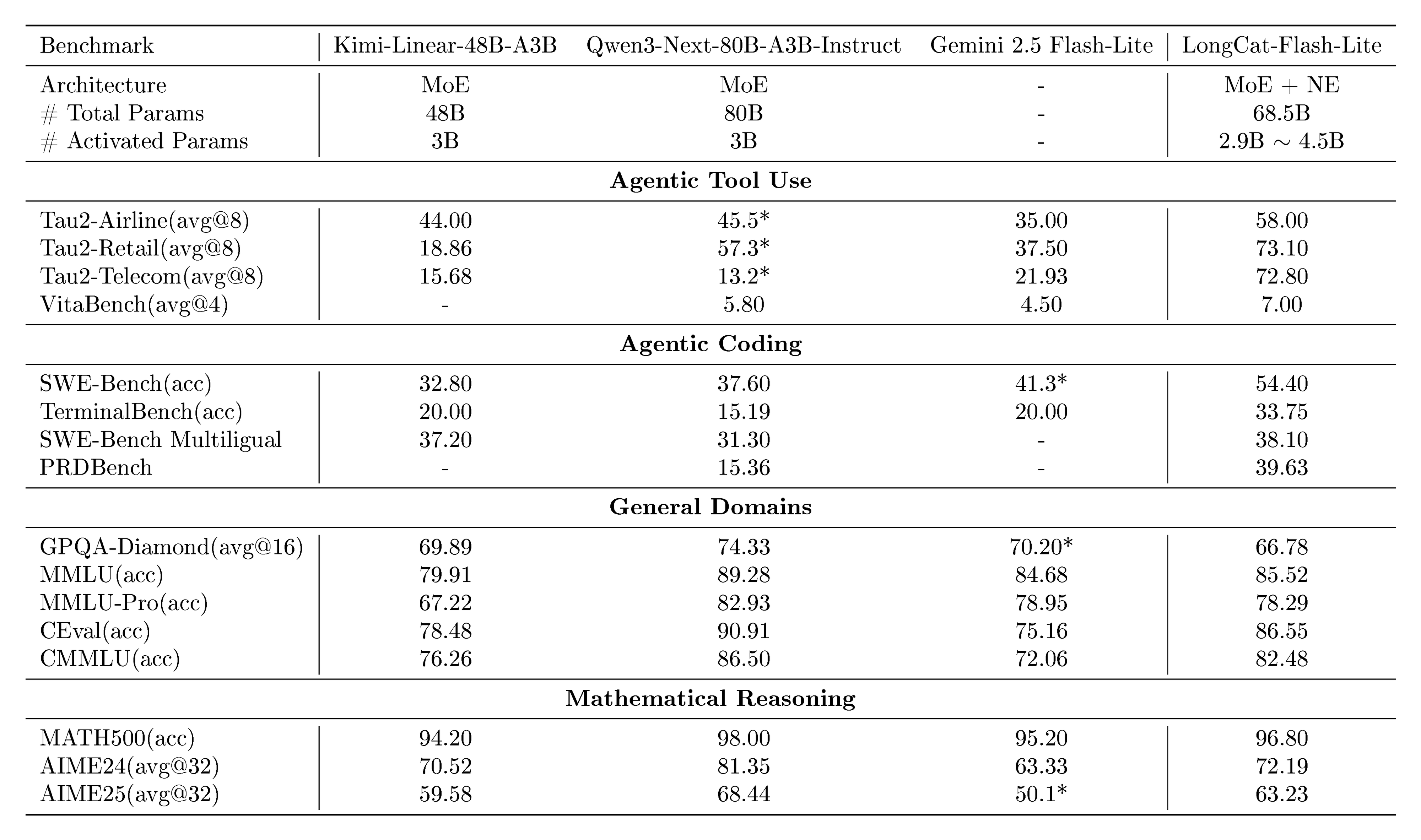 Table 2 presents the comprehensive evaluation results of LongCat-Flash-Lite across various benchmark categories, along with comparisons with Qwen3-Next-80B-A3B-Instruct, Gemini 2.5 Flash-Lite[^4], and Kimi-Linear-48B-A3B. LongCat-Flash-Lite demonstrates exceptional parameter efficiency and competitive performance across core capability dimensions.