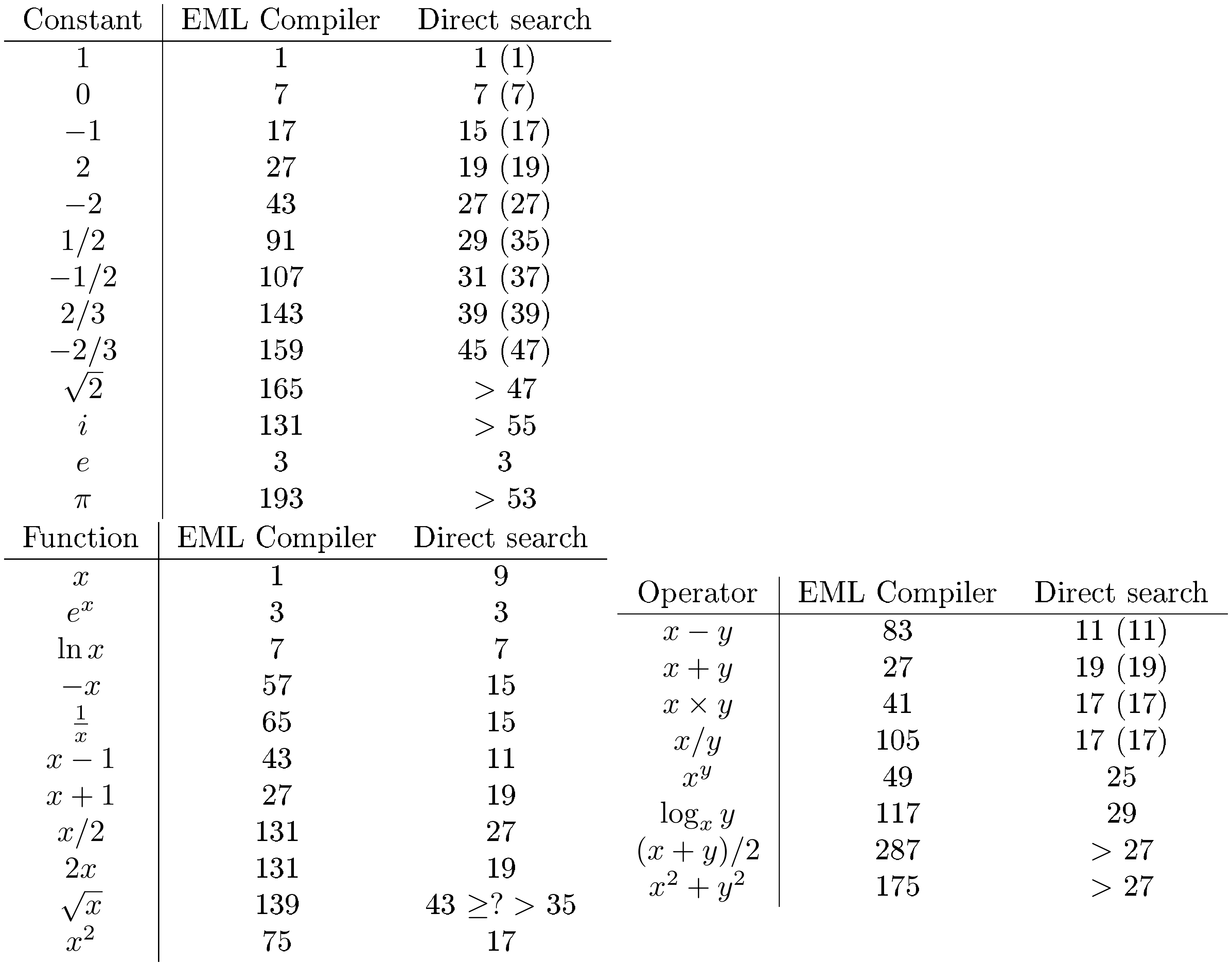 | EML | $1$ | none | $\operatorname{eml}{(x, y)}$ | 3 |