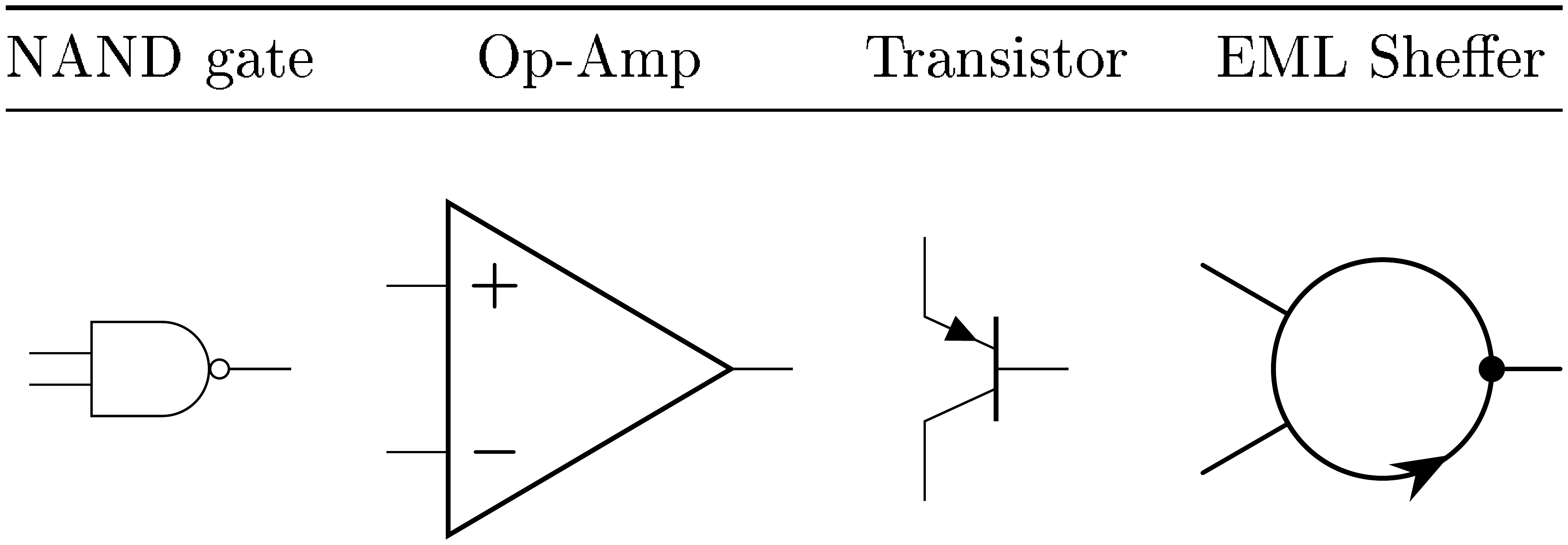 The operator EML, Equation 3, provides a single sufficient primitive from which real elementary functions can be constructed and evaluated. Consequently, a wide class of computations built from such functions can also be cast in EML form. It is not unique; several close variants are likely to exhibit similar properties, including EDL, Equation 4b, and the swapped-argument form $- \operatorname{eml}(y, x)$, Equation 4c. More operators of this kind exist. Perhaps an entire continuous family of them awaits discovery, with properties more convenient than Equation 3. For example, the requirement for one of the constants: $-\infty, 1, e, \ldots$ to be always present among terminal symbols makes its use less elegant and more complicated (cf. Subsect. Section 4.3) in comparison with, e.g., standard neural nets or the NAND gate. The latter is able to generate[^3] 0s and 1s out of 'anything'. The EML operator does not have this useful property. Whether an EML-type binary Sheffer working without pairing with a distinguished constant exists is an open question. Proving such impossibility for any given candidate is non-trivial: one might expect $f(x, x)$ being constant to suffice, but consider $B(x, y) ! = ! x !-! \tfrac{y}{2}$, for which $B(x, x) ! = ! \tfrac{x}{2}$ yet $B(B(x, x), x) ! = ! 0$. Such traps illustrate why systematic search is essential in this work. A ternary operator, $T(x, y, z)! = ! {e^x}/{\ln{x}} \times {\ln{z}}/{e^y}$, for which $T(x, x, x)! =! 1$ is next candidate for further analysis [47].