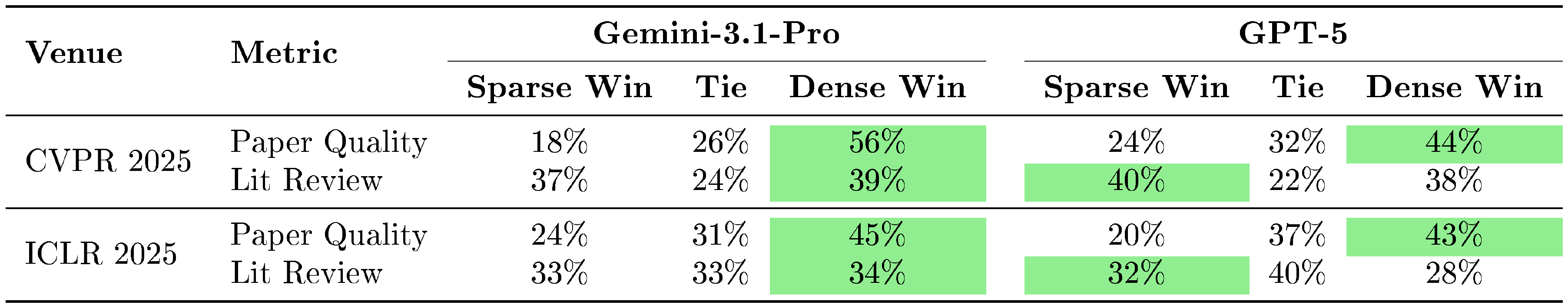 Table 5 evaluates the impact of input density. For Overall Paper Quality, the Dense idea setting dominates win rates (43%–56% vs. 18%–24%) by facilitating more rigorous methodology generation. Meanwhile, Literature Review Quality exhibits near-parity, with the Sparse setting securing 32%–40% against Dense's 28%–39%. This demonstrates the exceptional robustness of $\textsc{PaperOrchestra}$: our Literature Review Agent autonomously executes targeted searches and identifies research gaps without relying heavily on the dense input drafted by human. Additional qualitative comparisons are provided in App. Appendix E.2.