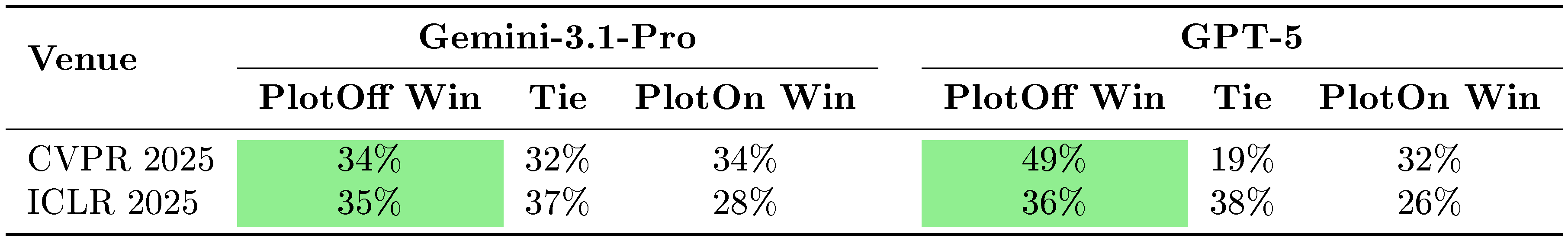 Table 6 evaluates our Plotting Agent by comparing papers using human-authored GT figures (PlotOff) vs. autonomously generated visuals (PlotOn). Although PlotOff benefits from an inherent information advantage (GT figures often embed supplementary results absent from raw input logs), PlotOn remains highly competitive, securing ties or wins in 51%–66% of SxS matchups across all four setups. As shown in App. Appendix E.1, $\textsc{PaperOrchestra}$ synthesizes coherent visuals from scratch, effectively augmenting the manuscript and reinforcing the scientific narrative.