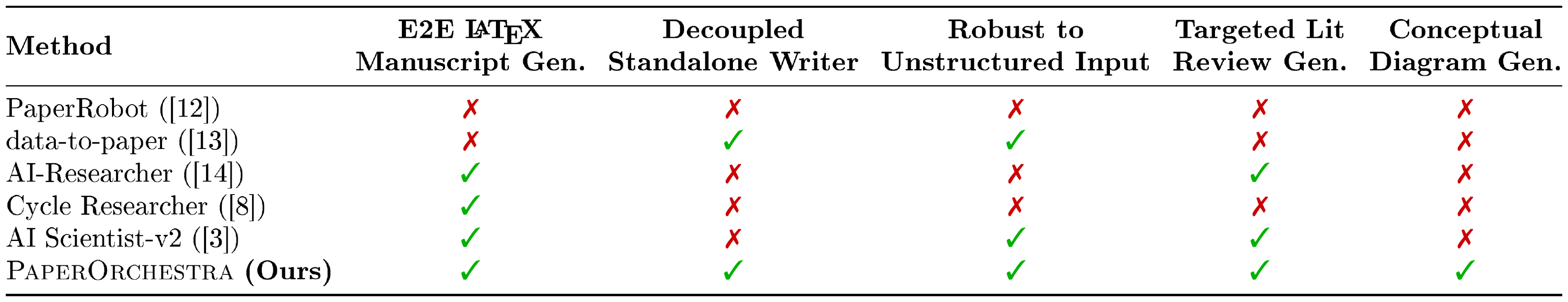 As summarized in Table 1, existing pipelines show key limitations when used as standalone manuscript generators. Frameworks like CycleResearcher ([8]) require a structured BibTeX reference list as input, which is rarely available at the start of writing, and fail on unstructured inputs outside this format. While AI-Researcher ([14]) and AI Scientist-v2 ([3]) accept unstructured topic descriptions, their writing modules rely on artifacts produced earlier in their internal pipelines and do not generate conceptual scientific diagrams. In contrast, $\textsc{PaperOrchestra}$ can process unconstrained pre-writing materials without relying on pre-existing plots or ground-truth references. By orchestrating specialized agents to autonomously synthesize targeted literature, generate comprehensive visuals, and craft coherent scientific narratives, $\textsc{PaperOrchestra}$ establishes a robust, end-to-end pipeline for AI research manuscript generation.