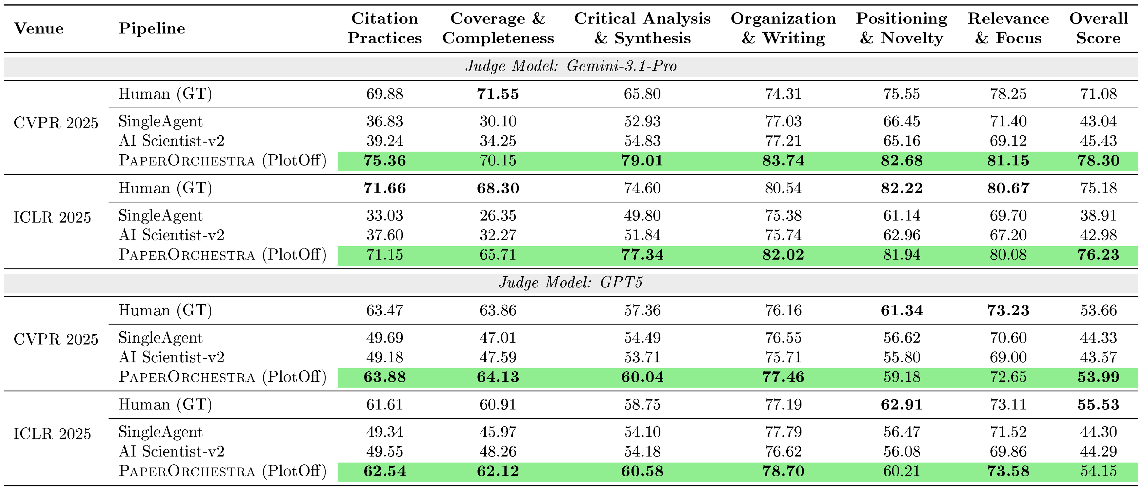Human preferences correlate strongly with our GPT-5 evaluator for Overall Quality (Pearson $r=0.6458$, Spearman $\rho=0.6355$; Figure 3b). Literature review correlation is lower due to inherent LLM self-bias. Manual inspection reveals LLMs tend to act as structural graders, rewarding rigid formatting such as explicit "Problem-Gap-Solution" paragraphs or bulleted thematic groups. In contrast, human experts prioritize dense, pragmatic factuality and a nuanced, narrative-driven flow, which the autorater often mistakenly penalizes for lacking explicit formatting cues. Nevertheless, relative rankings remain strictly consistent. The stability of our automated SxS metrics is further validated by high inter-autorater agreement across different LLM judges (Figure 3b). Human SxS evaluations (Figure 3a) confirm $\textsc{PaperOrchestra}$ strongly outperforms AI baselines by absolute margins of 50%–68% (Literature Review) and 14%–38% (Overall Quality). It also achieves a highly competitive 43% tie/win rate against human GT in literature synthesis.