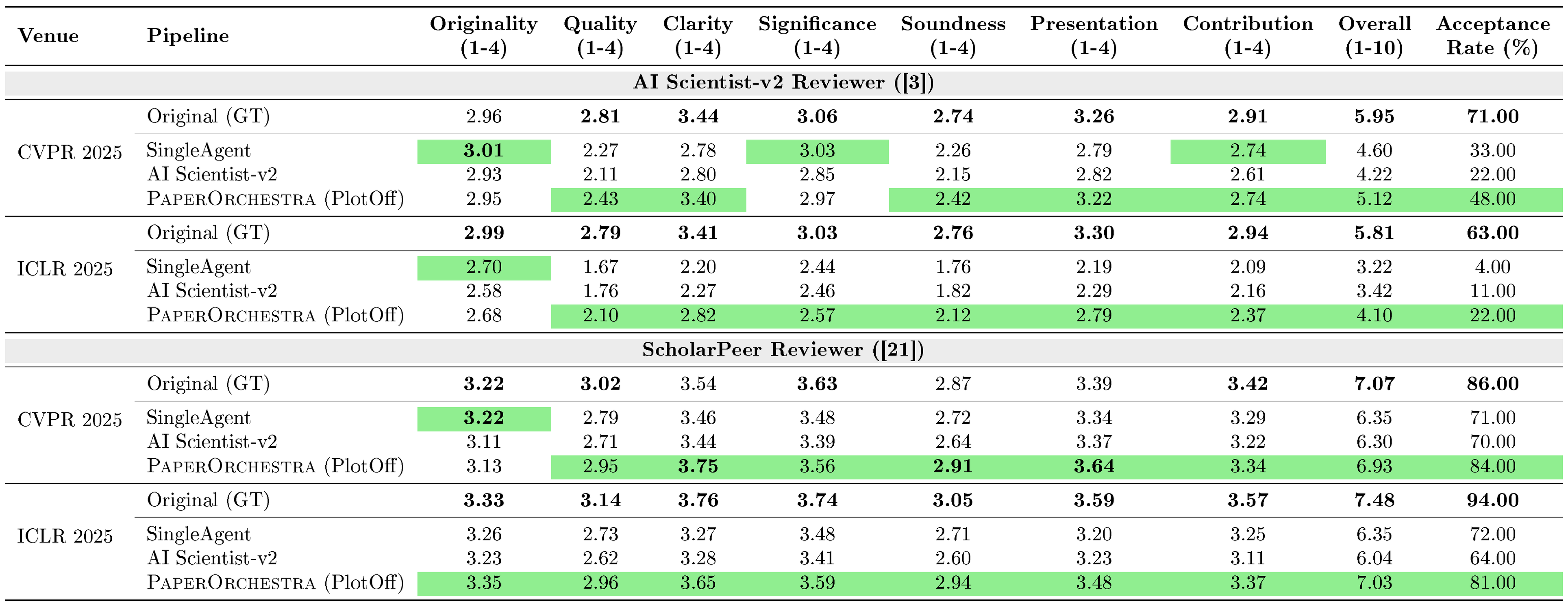 As detailed in Table 2, we evaluate holistic manuscript quality using the AI Scientist-v2 and ScholarPeer frameworks. Under ScholarPeer, $\textsc{PaperOrchestra}$ achieves high simulated acceptance rates of 84% (CVPR) and 81% (ICLR), closely tracking Human (GT) baselines (86% and 94%, respectively). It significantly outperforms existing AI pipelines, delivering absolute acceptance gains of 13% (CVPR) and 9% (ICLR) over the strongest autonomous baseline. Beyond acceptance rates, $\textsc{PaperOrchestra}$ dominates across critical sub-axes (notably Clarity, Presentation, and Soundness), demonstrating that our multi-agent system yields structurally coherent and technically sound manuscripts.