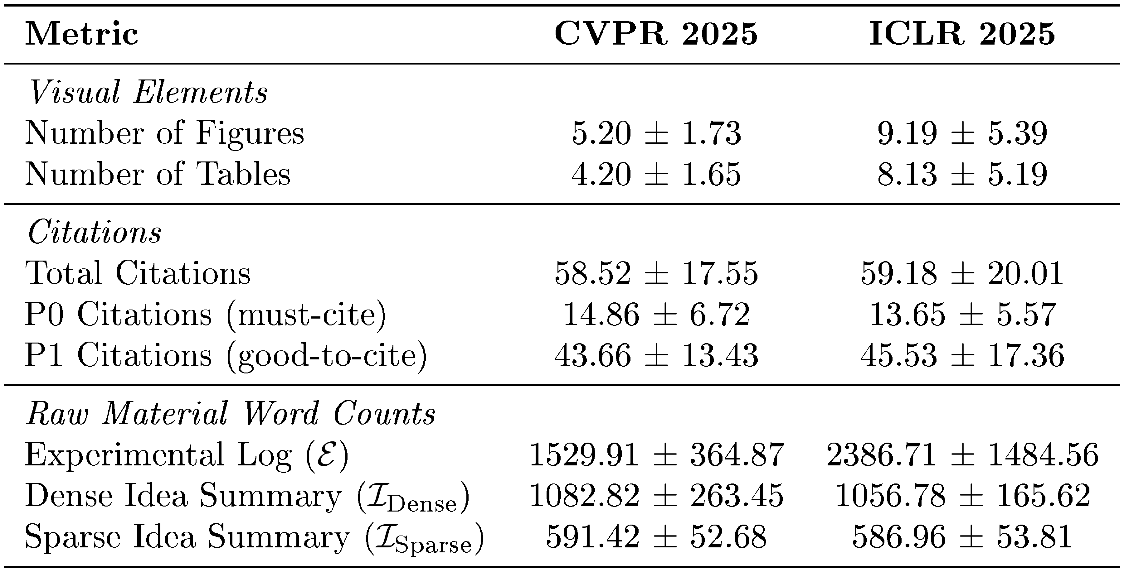 In this section, we detail the data distribution of PaperWritingBench. As shown in Figure 5, Figure 6 and Table 8, ICLR 2025 papers exhibit higher visual and analytical density than CVPR 2025, averaging roughly twice as many figures (9.19 vs. 5.20) and tables (8.13 vs. 4.20). Consequently, ICLR experimental logs are substantially longer (2, 387 vs. 1, 530 words). To ensure controlled evaluations, reverse-engineered input materials remain strictly consistent across both venues: Dense idea files average 1, 083 (CVPR) and 1, 057 (ICLR) words, while Sparse idea files are constrained to 591 (CVPR) and 587 (ICLR) words. Both datasets maintain comparable citation distributions, averaging ${\sim}59$ total references per manuscript.