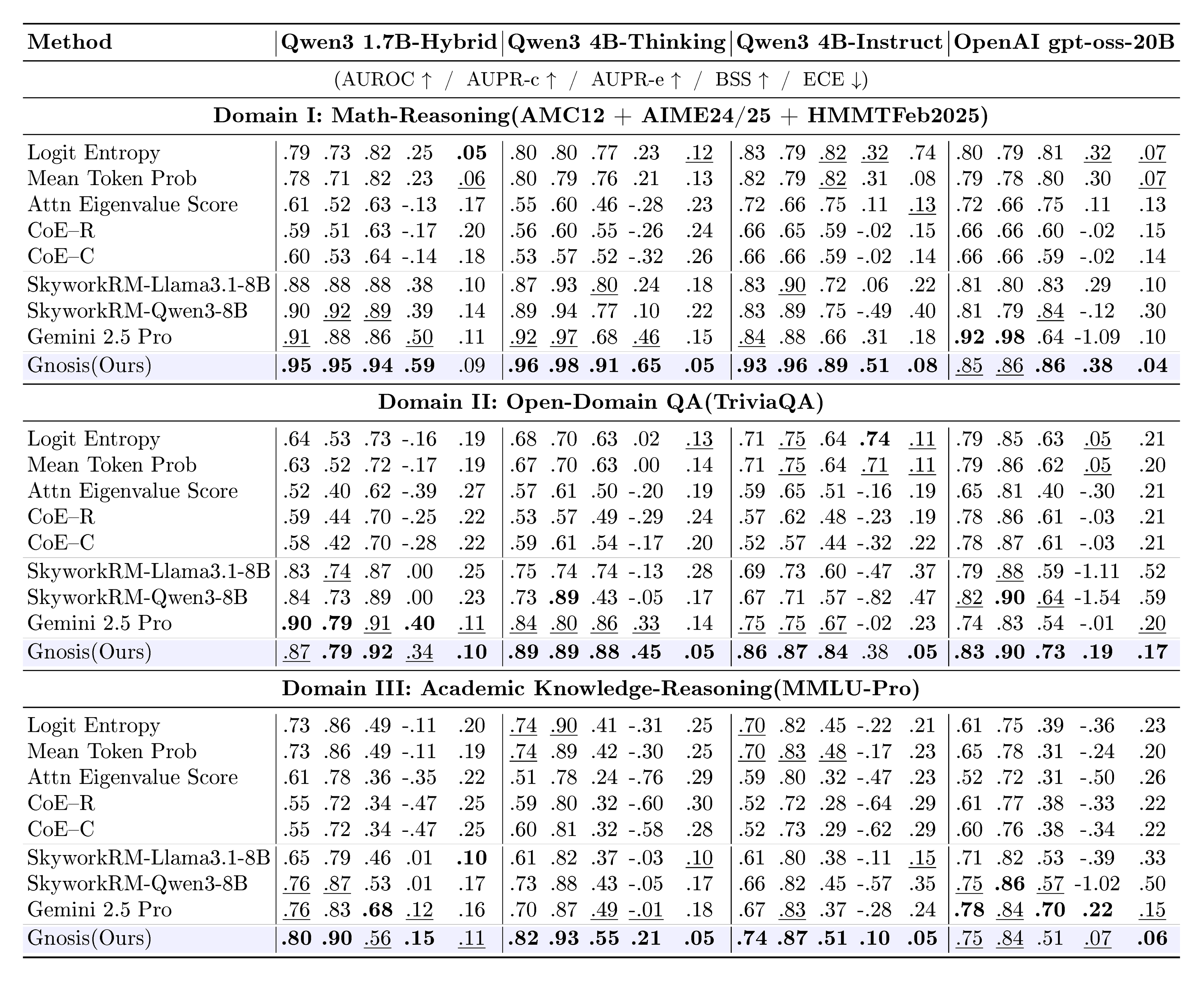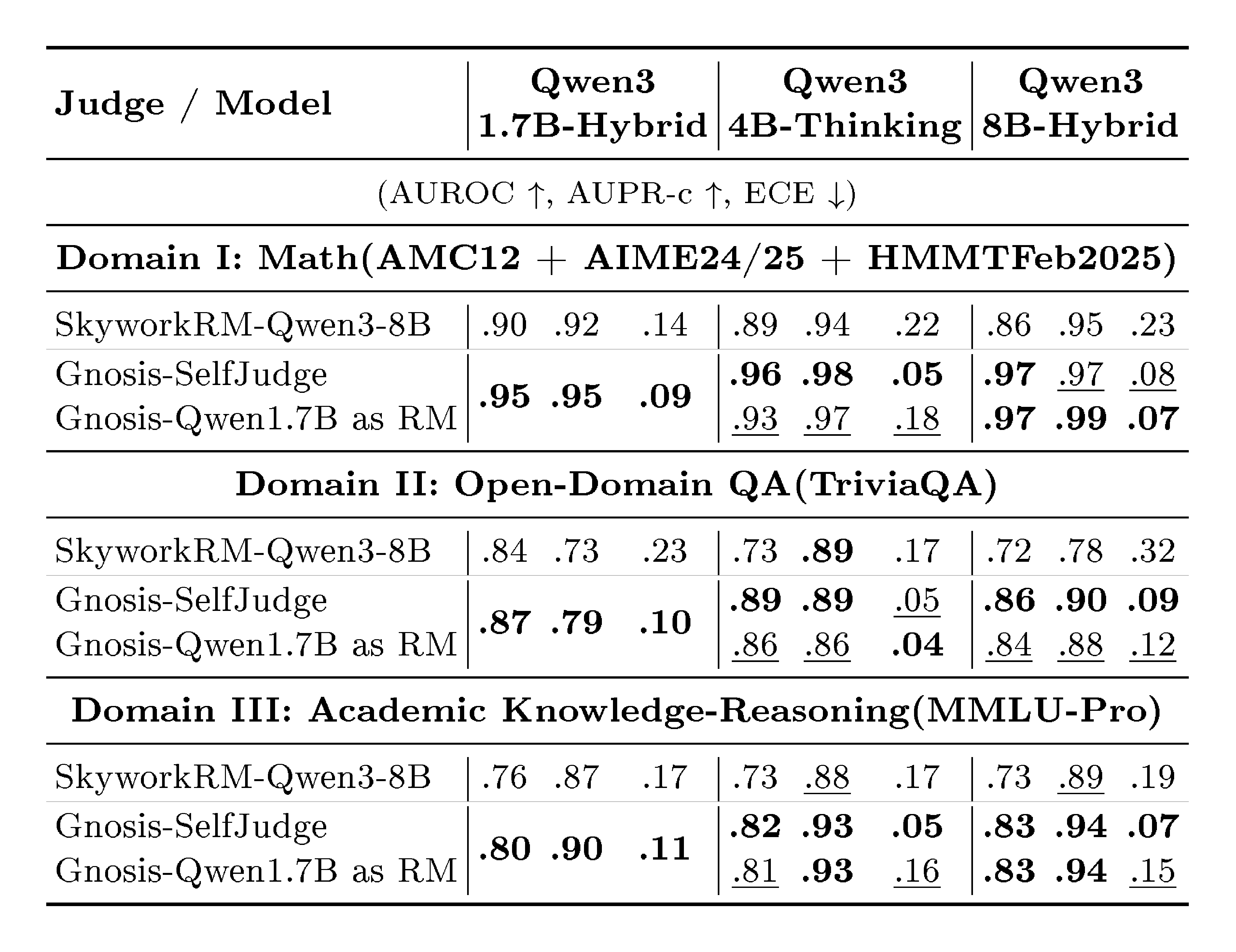 Section Summary: Gnosis is a simple tool added to pre-trained AI language models that helps them spot their own mistakes by looking at their internal thought processes, without needing outside help. Even though it only adds about five million parameters, Gnosis works better than massive reward systems with billions of parameters or big commercial AIs like Gemini 2.5 Pro, proving that reliable error signals are built right into how these models generate responses. This sets a new benchmark for efficient, self-checking AI that can catch problems with almost no extra computing power.