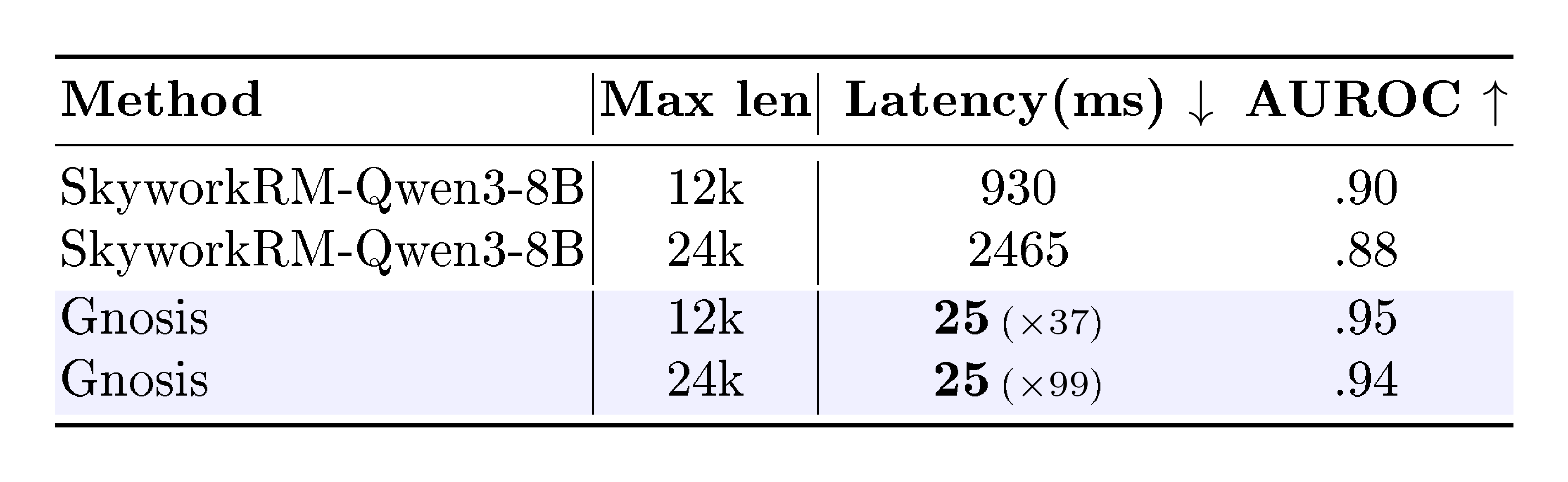 Efficiency vs. Scale: With only $\sim$ 5M parameters and negligible overhead from its fixed-budget projection, Gnosis matches or exceeds state-of-the-art Skywork 8B Reward Models ($\sim$ 1000 $\times$ larger) and the proprietary Gemini 2.5 Pro. This is notable because Gnosis adds no independent world knowledge. Rather than fact-checking with massive parametric memory, it detects the signatures of hallucination and reasoning error in the backbone’s internal traces. On complex Math Reasoning, Gnosis surpasses both large judges. It also outperforms Gemini on MMLU-Pro, a domain it was not explicitly trained on, suggesting that it learns transferable error patterns instead of task-specific cues. Additionally, Gnosis maintains near-constant $\sim$ 25ms latency and achieves roughly $37\times$ and $99\times$ speedups over the 8B reward model when judging answers of length 12k and 24k tokens, respectively (Table 4). These results show that intrinsic self-verification can be both more scalable and far cheaper than external oversight.
