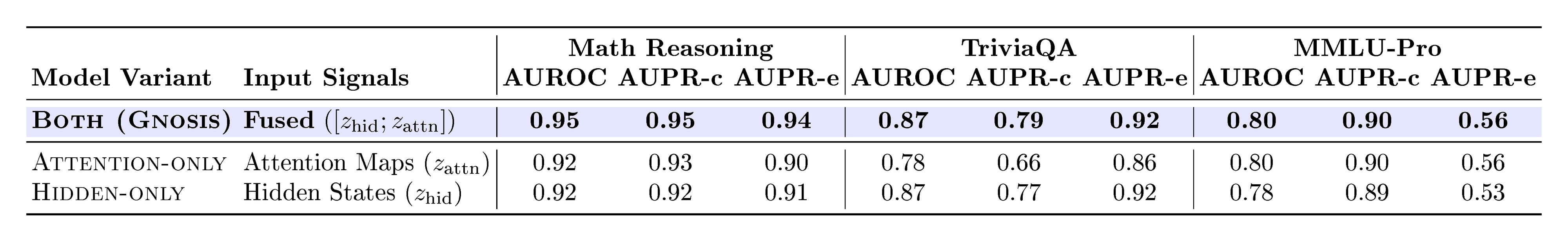 Hidden vs. Attention Circuits. Gnosis fuses a hidden-state and an attention circuit. Appendix Table 5 shows that both streams help, but attention is most useful for long-form reasoning: on TriviaQA, hidden-only dominates and fusion adds little, indicating hidden states carry most short factual reliability; on Math Reasoning and MMLU-Pro, attention-only is strong (even slightly better than hidden-only on MMLU-Pro), and fusion yields the best overall performance, suggesting complementary structural cues that emerge in longer reasoning.