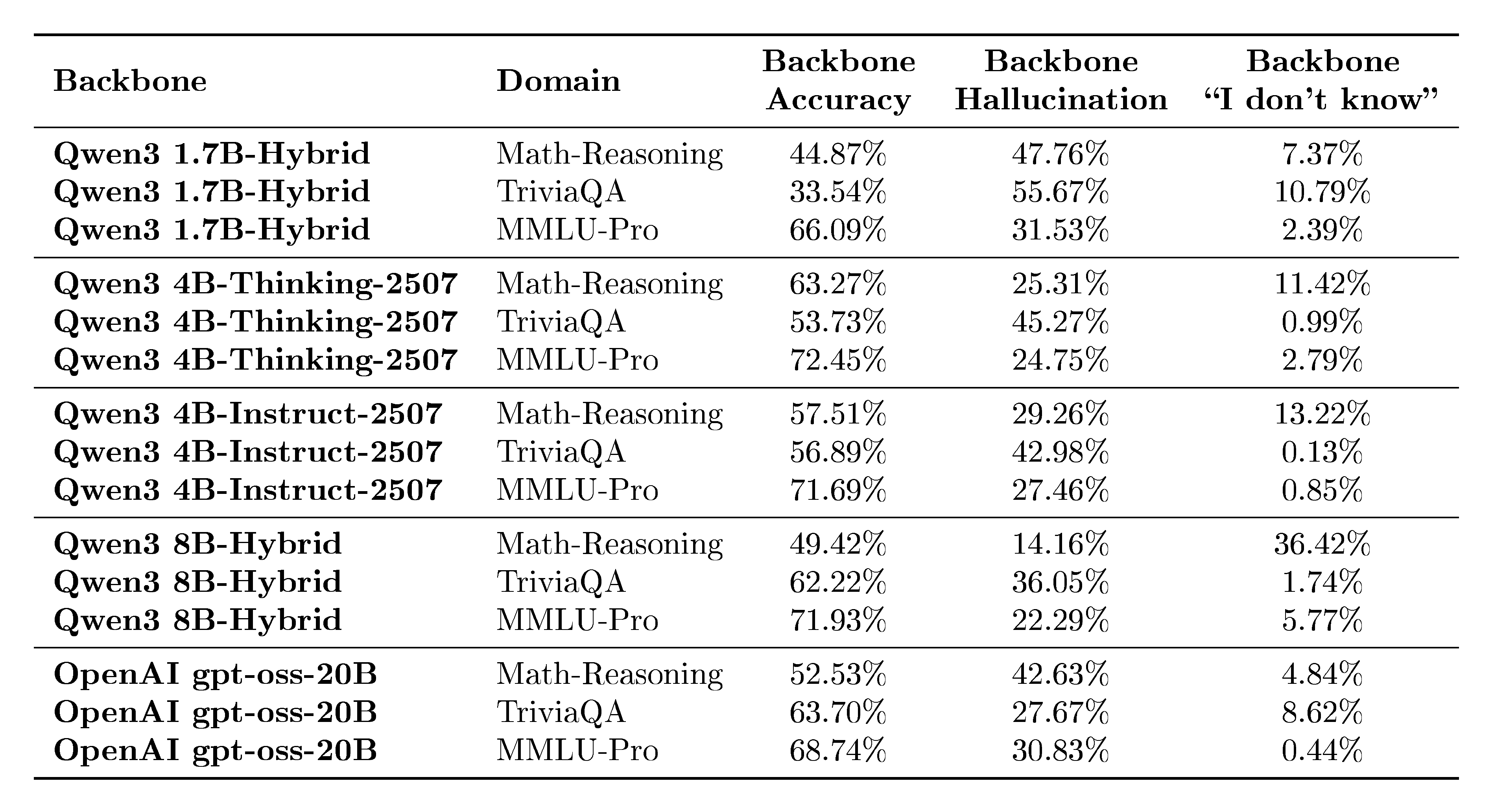 ::: {caption="Table 9: Backbone outcome rates (%) across evaluation domains. For each frozen backbone, we report the fraction of instances that are correct (Accuracy), incorrect (Hallucination), or no-answer ("I don't know"/refusal/empty). No-answer cases are shown for completeness but are filtered out from our correctness-prediction evaluation (Table 1)."}