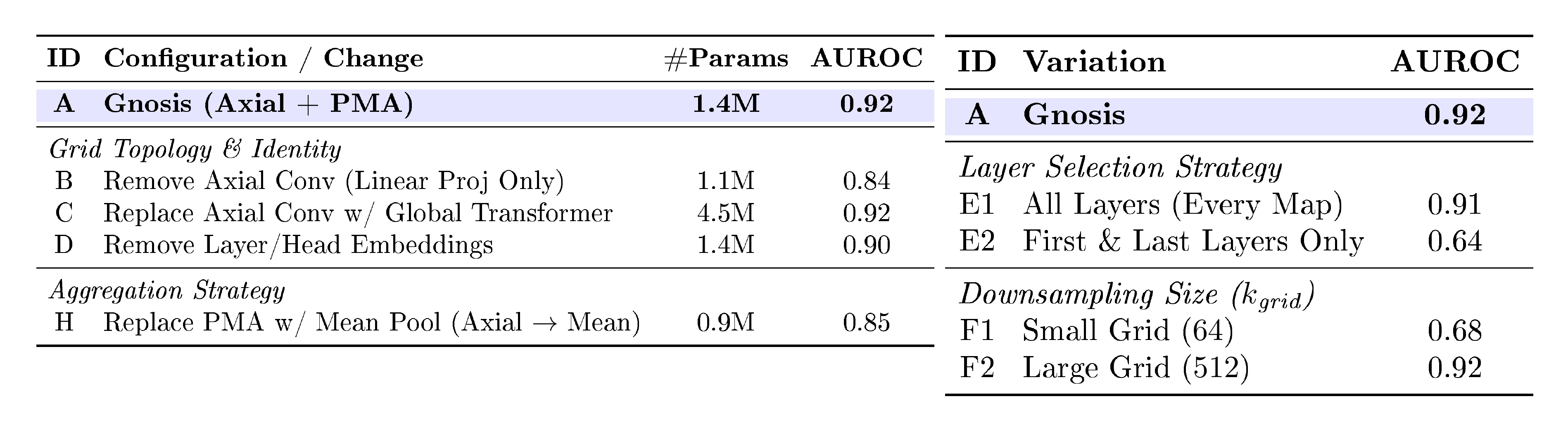 Aggregation Strategy. Finally, we analyzed how to summarize the grid into a fixed vector. Replacing our query-based Pooling by Multihead Attention (PMA) with simple mean pooling (Row H in Table 7) causes a sharp drop in accuracy. This suggests that Gnosis benefits from learning specific "reliability prototypes" (via PMA seeds) rather than uniformly averaging all attention circuits, likely because only a small subset of heads carry high-fidelity correctness signals.