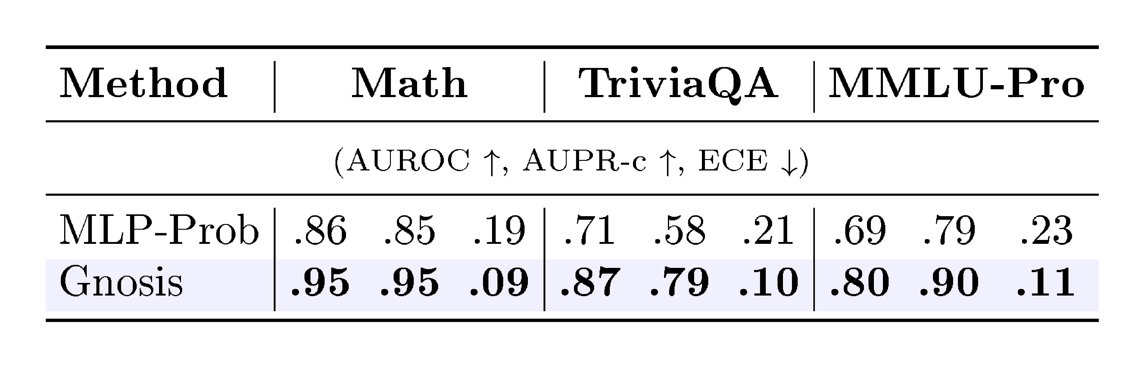 Superiority Over Internal Baselines and Probes. Across Math Reasoning and Open-Domain QA, Gnosis effectively solves the miscalibration of standard confidence metrics. It consistently lifts AUROC from the mid-0.7s (typical of Logit Entropy) to 0.95–0.96 while roughly doubling the BSS, turning negative calibration scores into strongly positive ones. Crucially, Gnosis outperforms the learned MLP-Prob final-token probe by 7–18 AUROC points across benchmarks. This consistent gap confirms that correctness is a property of the full generation trajectory, specifically the distributed hidden-state dynamics and attention patterns, rather than a state localized to the final token.