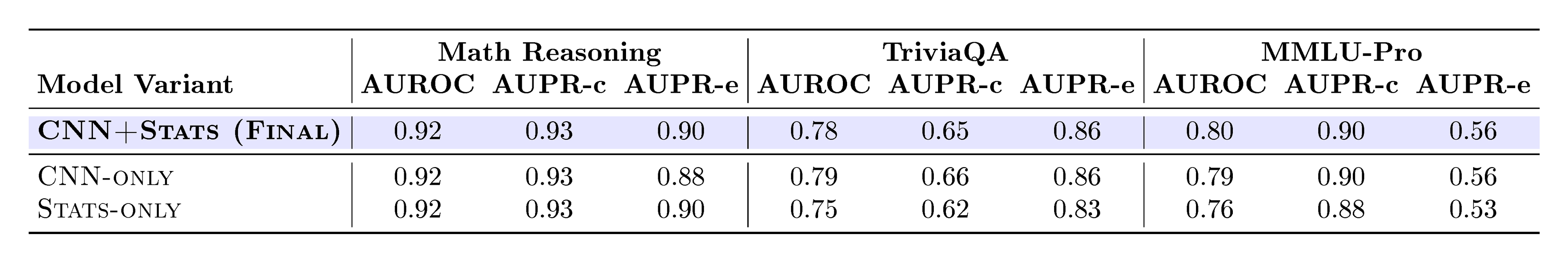 Feature Input Representation. We first assessed how best to encode individual attention maps. Table 6 compares a lightweight learned CNN, predefined statistics, and their combination across benchmarks. The predefined statistics remain competitive with the CNN (e.g., identical 0.92 AUROC on Math Reasoning), while providing a more interpretable per-map representation. Combining CNN and statistics yields comparable performance overall and modest gains on MMLU-Pro (0.80 AUROC).