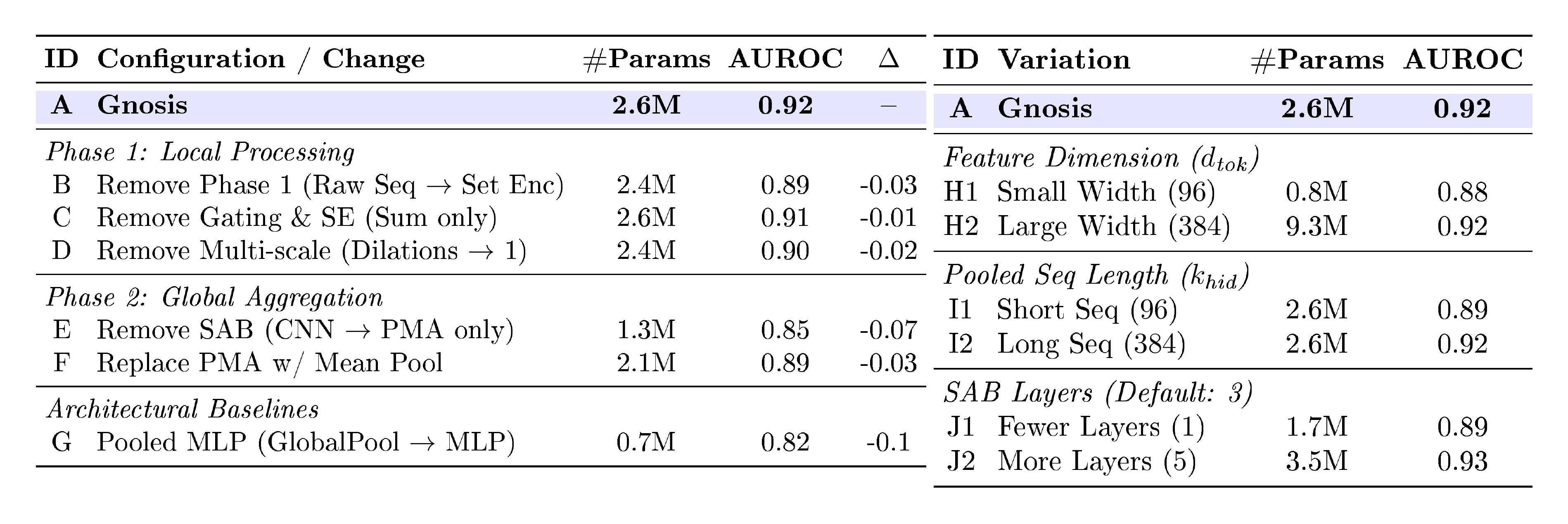 Local Temporal Encoder (Phase 1). We investigated whether explicit local feature extraction is necessary before global processing. Row B shows that feeding raw pooled sequences directly to the set encoder reduces performance by $0.04$ AUROC, confirming that Phase 1 acts as a critical denoising stage. Inside Phase 1, we found that architectural complexity matters: removing the Squeeze-and-Excite gating (Row C) or replacing the multi-scale dilated convolutions with a standard convolution (Row D) both degrade performance. This suggests the model relies on capturing multi-scale temporal signals (via dilation) and dynamic feature reweighting (via SE/Gating).