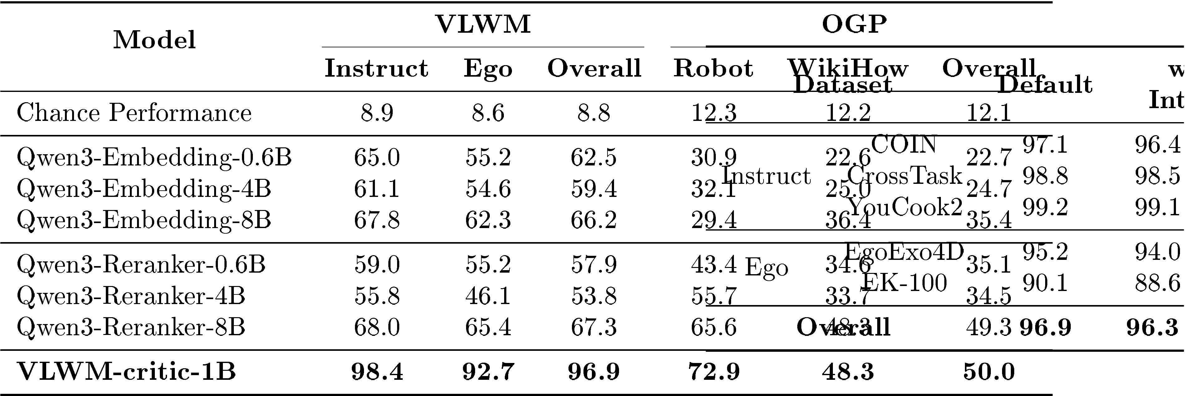 goal and a trajectory composed of a concatenation of NgoldN_\text{gold}Ngold steps of reference plan that achieves the goal, and NdistractorN_\text{distractor}Ndistractor irrelevant steps appended after, the task asks the critic model to independently evaluate costs for every partial progress from the beginning, i.e., C1=critic(goal,trajectory[0:1])C_1 = \mathbf{critic}(\texttt{goal}, \texttt{trajectory}[0:1])C1=critic(goal,trajectory[0:1]), C1=critic(goal,trajectory[0:2])C_1 = \mathbf{critic}(\texttt{goal}, \texttt{trajectory}[0:2])C1=critic(goal,trajectory[0:2]), …\dots…, until CNgold+Ndistractor=critic(goal,trajectory[0:Nbase+Ndistractor])C_{N_\text{gold}+N_\text{distractor}} = \mathbf{critic}(\texttt{goal}, \texttt{trajectory}[0:N_\text{base}+N_\text{distractor}])CNgold+Ndistractor=critic(goal,trajectory[0:Nbase+Ndistractor]). Since the distance to the goal should be the lowest after NgoldN_\text{gold}Ngold steps of reference plan, we calculate the goal achievement detection accuracy according to whether Ngold=argmin[C1,...,CNgold+Ndistractor]N_\text{gold}=\arg \min [C_1, ..., C_{N_\text{gold}+N_\text{distractor}}]Ngold=argmin[C1,...,CNgold+Ndistractor].goal field combines both goal description and goal interpretation. Since VLWM-critic-1B is trained on HowTo100M trajectories, we exclude it and only sample data from other sources of instruction videos (COIN, CrossTask, YouCook2), and egocentric recordings (EgoExo4D, EPIC-KITCHENS-100). 2) Open Grounded Planning (OGP): [63] released a collection of planning dataset containing goal-plan pairs sourced from different domains. We only use their "robot" subsets sourced from VirtualHoom and SayCan and WikiHow subset, since plans in the tool usage subset often contain too few number of steps. Different from VLWM data, trajectories in OGP only contain actions, and are OOD for both VLWM-critic-1B and baseline models. There are only 9,983 trajectories in OGP data.3.4.2 Procedural Planning on WORLDPREDICTION-PP\text{W{\scriptsize ORLD}P{\scriptsize REDICTION-PP}}WORLDPREDICTION-PP