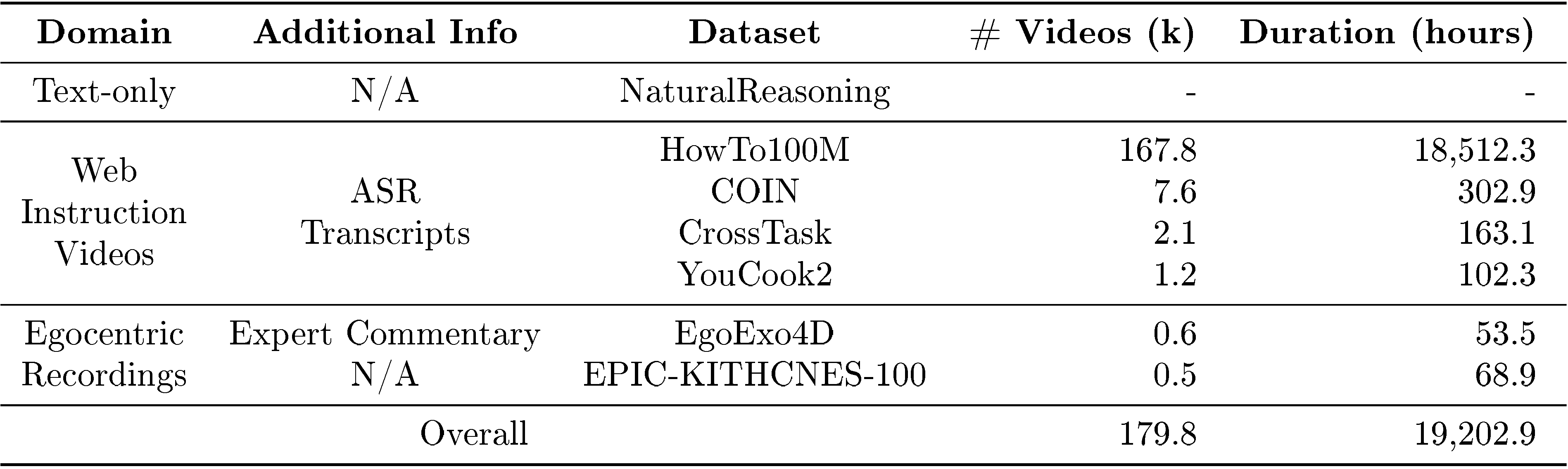 PE-G14 ([42]) and PerceptionLM-3B ([22]) (320 ×\times× 320 spatial resolution, 32 frames per input – can be fit in 32GB V100) to generate the TREE oF cAPTIONS\text{T{\scriptsize REE} o{\scriptsize F} c{\scriptsize APTIONS}}TREE oF cAPTIONS. We sample up to 5 target window per video according to the tree structure (the first 5 nodes in BFS traversal order), and use Llama-4 Maverick (mixture of 128 experts, 17B activated and 400B total parameters, FP8 precision) to extract plans from the window with the sub-tree of captions and two rounds of SELF-REFINE\text{S{\scriptsize ELF-}R{\scriptsize EFINE}}SELF-REFINE. Additional speech transcripts for web videos and the expert commentary in EgoExo4D are provided along with video captions to improve LLM's video understanding during plan extraction. In addition to video-based extraction, we repurposed the NaturalReasoning ([34]) dataset to world modeling by replacing TREE oF cAPTIONS\text{T{\scriptsize REE} o{\scriptsize F} c{\scriptsize APTIONS}}TREE oF cAPTIONS with the chain-of-thoughts. Action-state trajectories are extracted by LLM SELF-REFINE\text{S{\scriptsize ELF-}R{\scriptsize EFINE}}SELF-REFINE with similar prompts.PerceptionLM-8B ([22]) to initialize our VLWM. The model is trained with a batch size of 128 and a maximum of 11.5k token context length. We perform uniform sampling of 32 frames in 4482^22 resolution for visual context inputs. With 12 nodes of 8 ×\times× H100 GPUs, the training takes approximately 5 days.3.1.2 VLWM-critic-1B