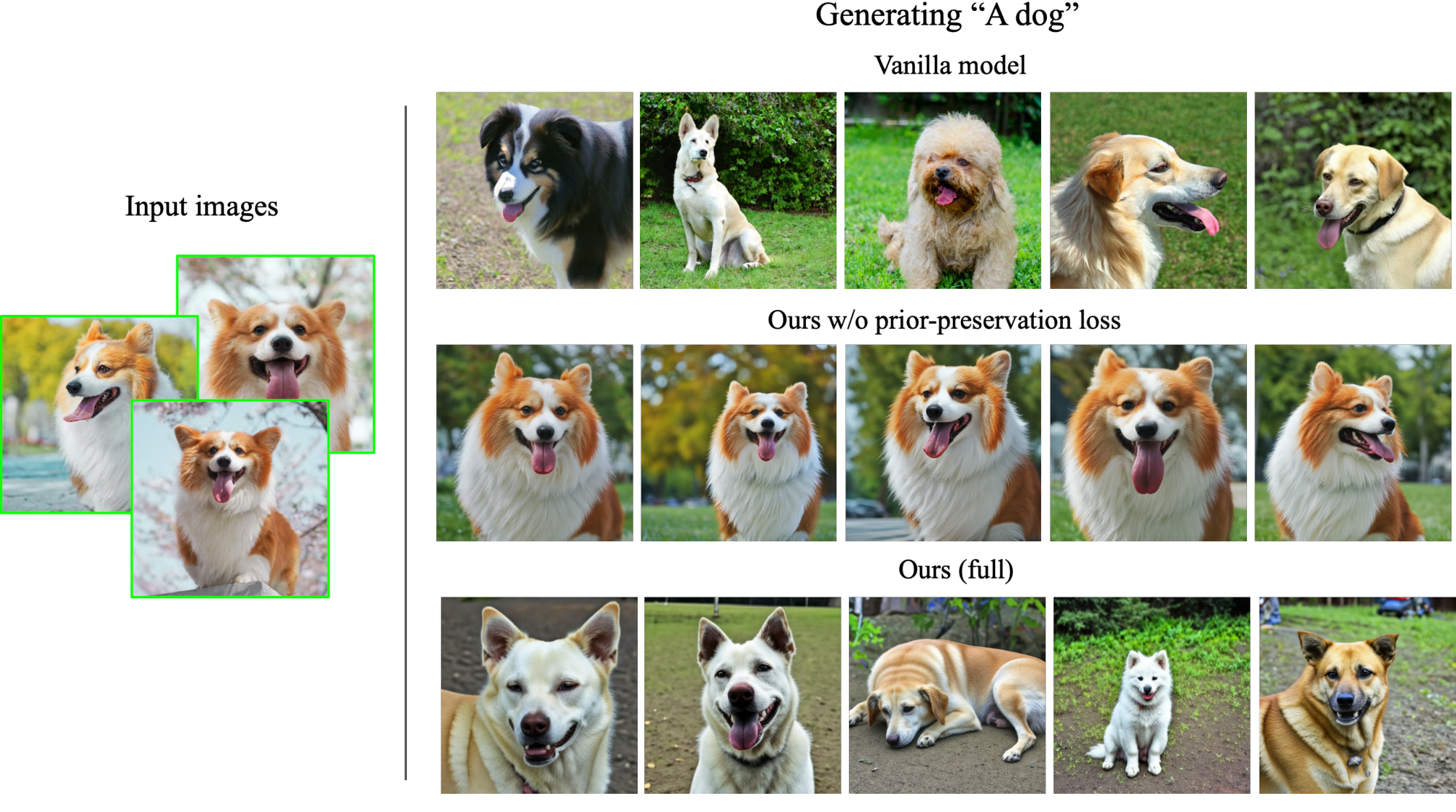 We fine-tune the text-to-image model with the input images and text prompts containing a unique identifier followed by the class name of the subject (e.g., "A [V] dog”). The latter enables the model to use its prior knowledge on the subject class while the class-specific instance is bound with the unique identifier. In order to prevent language drift [4, 5] that causes the model to associate the class name (e.g., ``dog") with the specific instance, we propose an autogenous, class-specific prior preservation loss, which leverages the semantic prior on the class that is embedded in the model, and encourages it to generate diverse instances of the same class as our subject.