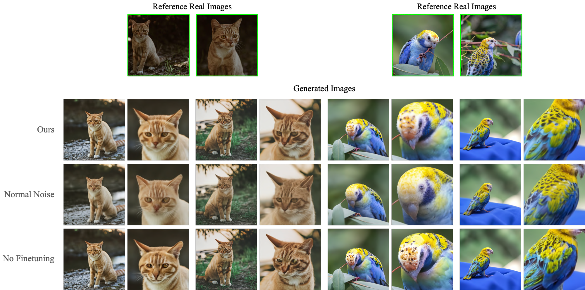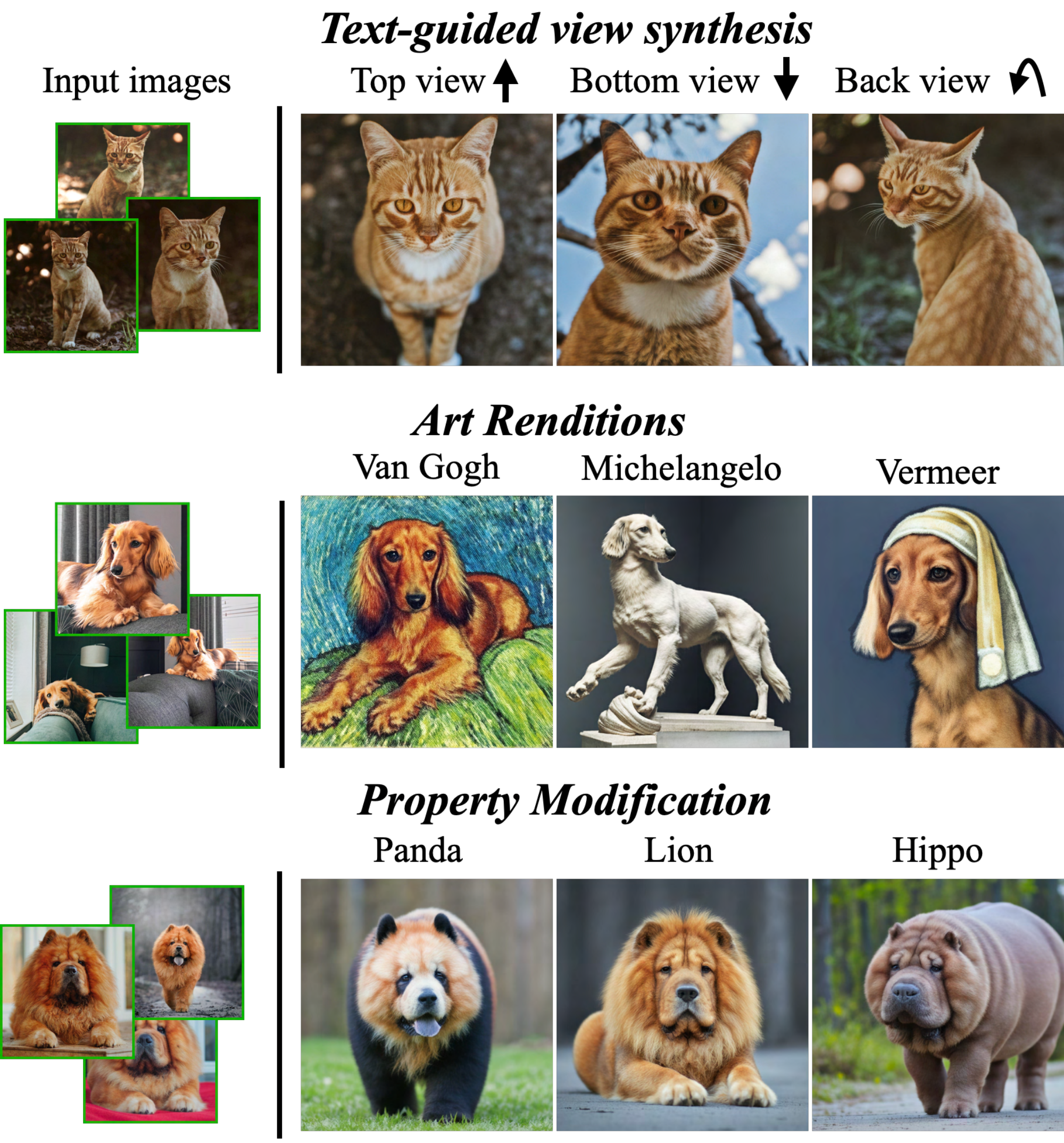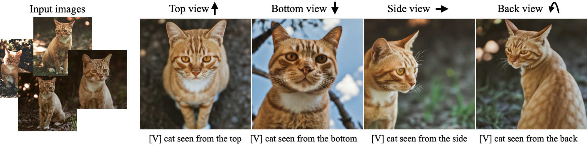 We are able to render the subject under novel viewpoints. In Figure 7, we generate new images of the input cat (with consistent complex fur patterns) under new viewpoints. We highlight that the model has not seen this specific cat from behind, below, or above - yet it is able to extrapolate knowledge from the class prior to generate these novel views given only 4 frontal images of the subject.