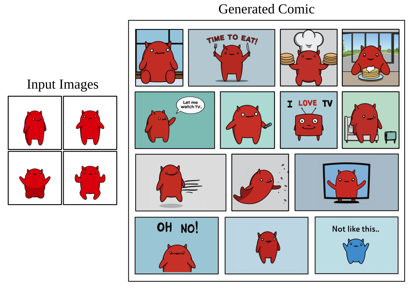 In addition to photorealistic images, our method is able to capture the appearance of drawn media and more. In Figure 17 we present, to the best of our knowledge, the first instance of a full comic with a persistent character generated by a generative model. Each comic frame was generated using a descriptive prompt (e.g "a [V] cartoon grabbing a fork and a knife saying ``time to eat"'').