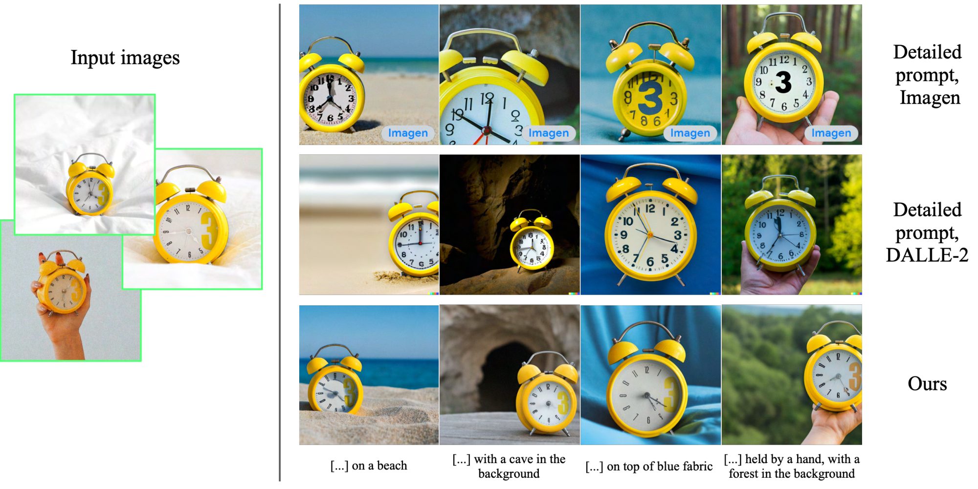 ![**Figure 1:** **Subject-driven generation.** Given a particular clock (left), it is hard to generate it while maintaining high fidelity to its key visual features (second and third columns showing DALL-E2 [2] image-guided generation and Imagen [1] text-guided generation; text prompt used for Imagen: *``retro style yellow alarm clock with a white clock face and a yellow number three on the right part of the clock face in the jungle"*). Our approach (right) can synthesize the clock with high fidelity and in new contexts (text prompt: *``a [V] clock in the jungle"*).](https://ittowtnkqtyixxjxrhou.supabase.co/storage/v1/object/public/public-images/etc7g92r/background_im_1.png)