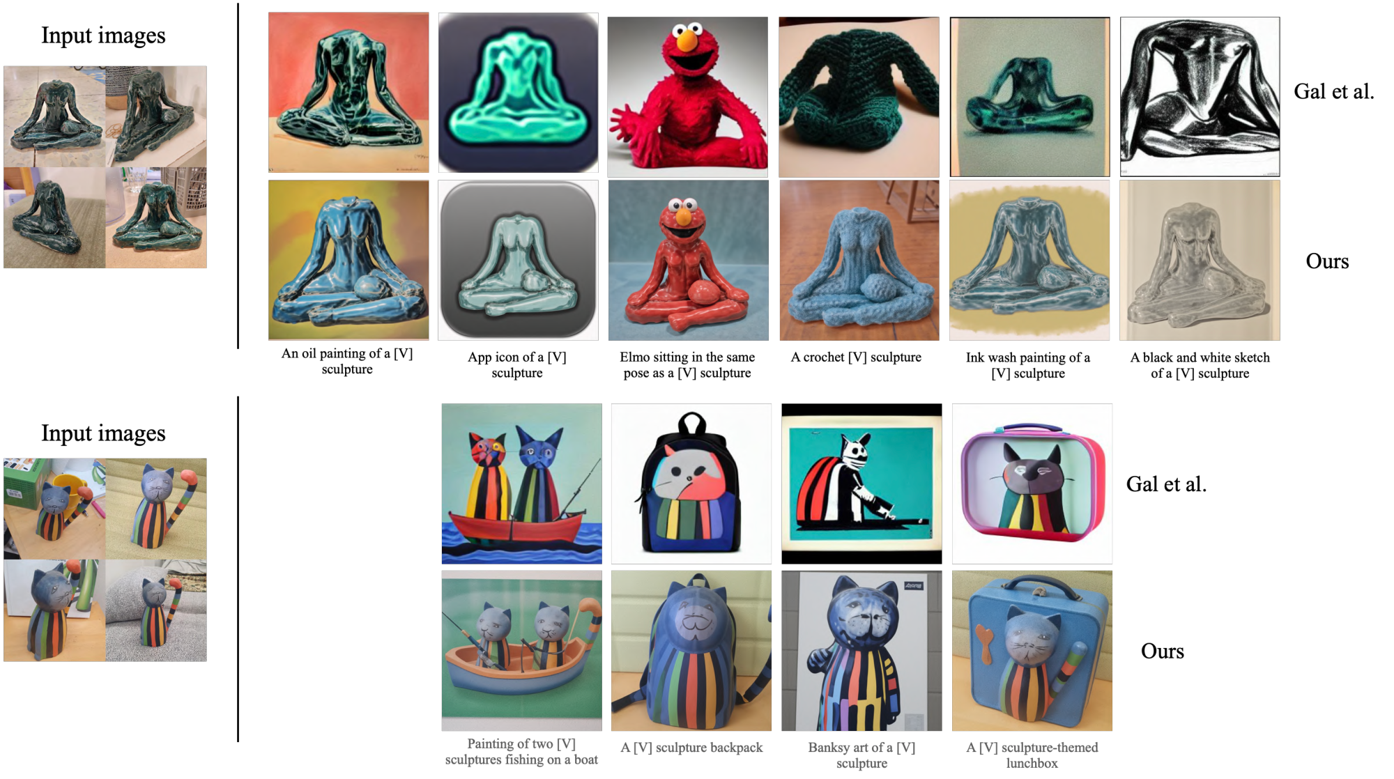 We include additional qualitative comparisons with Gal et al. [62] in Figure 21. For this comparison, we train our model on the training images of two objects appear in the teaser of their work (headless sculpture and cat toy) kindly provided by Gal et al. [62], and apply the prompts suggested in their paper. For prompts where they present several generated images, we handpicked their best sample (with the highest image quality and morphological similarity to the subject). We find that our work can generate the same semantic variations of these unique objects, with a high emphasis on preserving the subject identity, as can be seen, for instance, by the detailed patterns of the cat sculpture that are preserved.