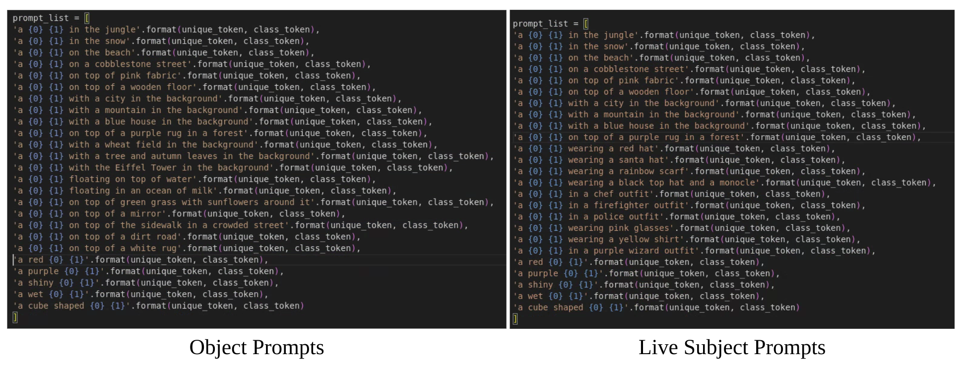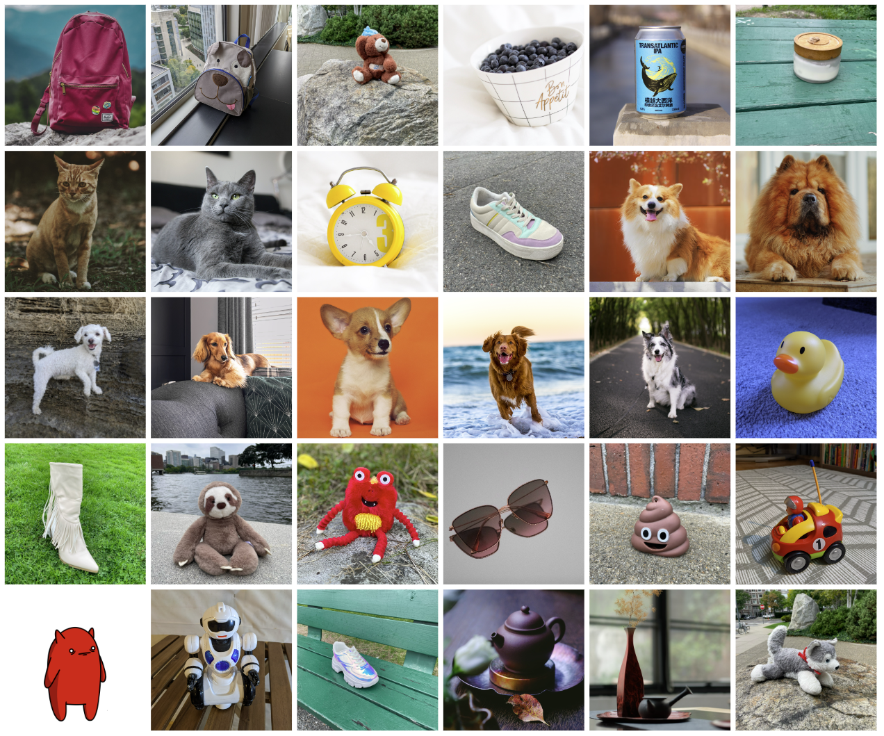 We collected a dataset of 30 subjects, including unique objects and pets such as backpacks, stuffed animals, dogs, cats, sunglasses, cartoons, etc. We separate each subject into two categories: objects and live subjects/pets. 21 of the 30 subjects are objects, and 9 are live subjects/pets. We provide one sample image for each of the subjects in Figure 4. Images for this dataset were collected by the authors or sourced from Unsplash [69]. We also collected 25 prompts: 20 recontextualization prompts and 5 property modification prompts for objects; 10 recontextualization, 10 accessorization, and 5 property modification prompts for live subjects/pets. The full list of prompts can be found in the supplementary material.