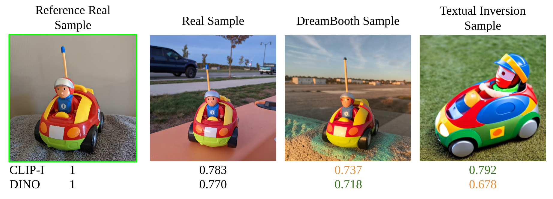 | Textual Inversion (Stable Diffusion) | 0.569 | 0.780 | 0.255 |