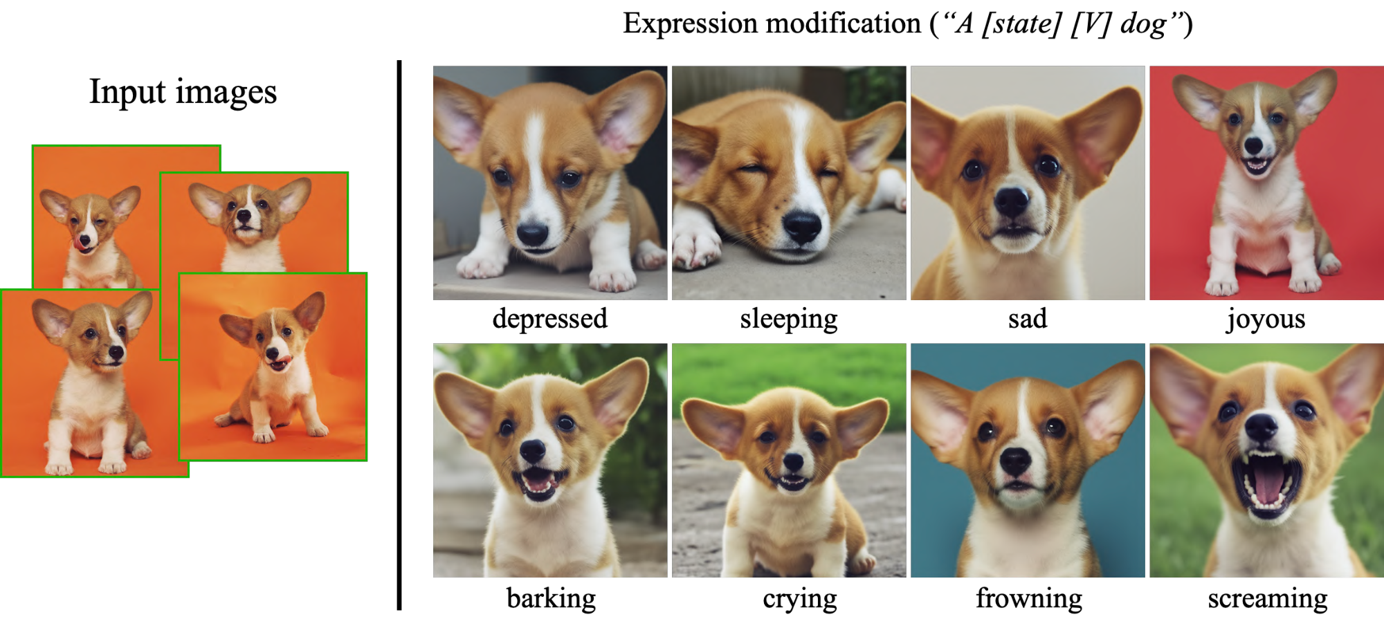 Our method allows for new image generation of the subject with modified expressions that are not seen in the original set of subject images. We show examples in Figure 13. The range of expressiveness is high, ranging from negative to positive valence emotions and different levels of arousal. In all examples, the uniqueness of the subject dog is preserved - specifically, the asymmetric white streak on its face remains in all generated images.