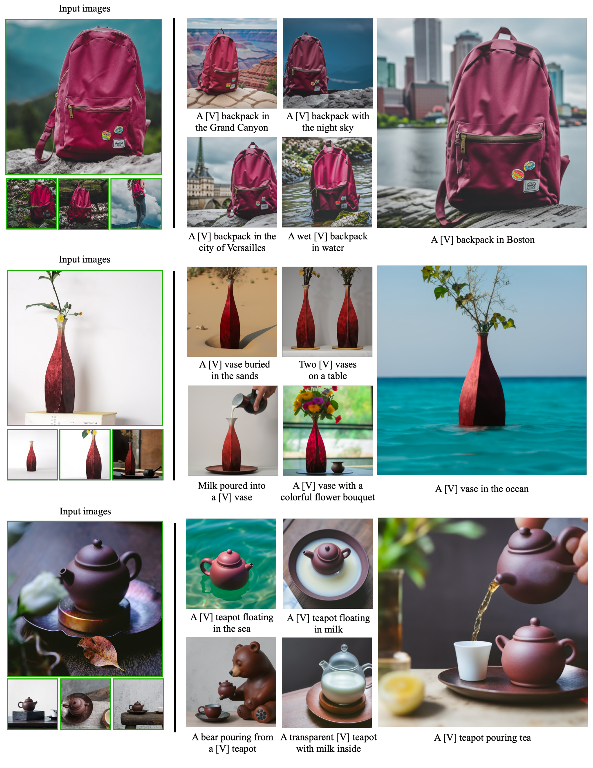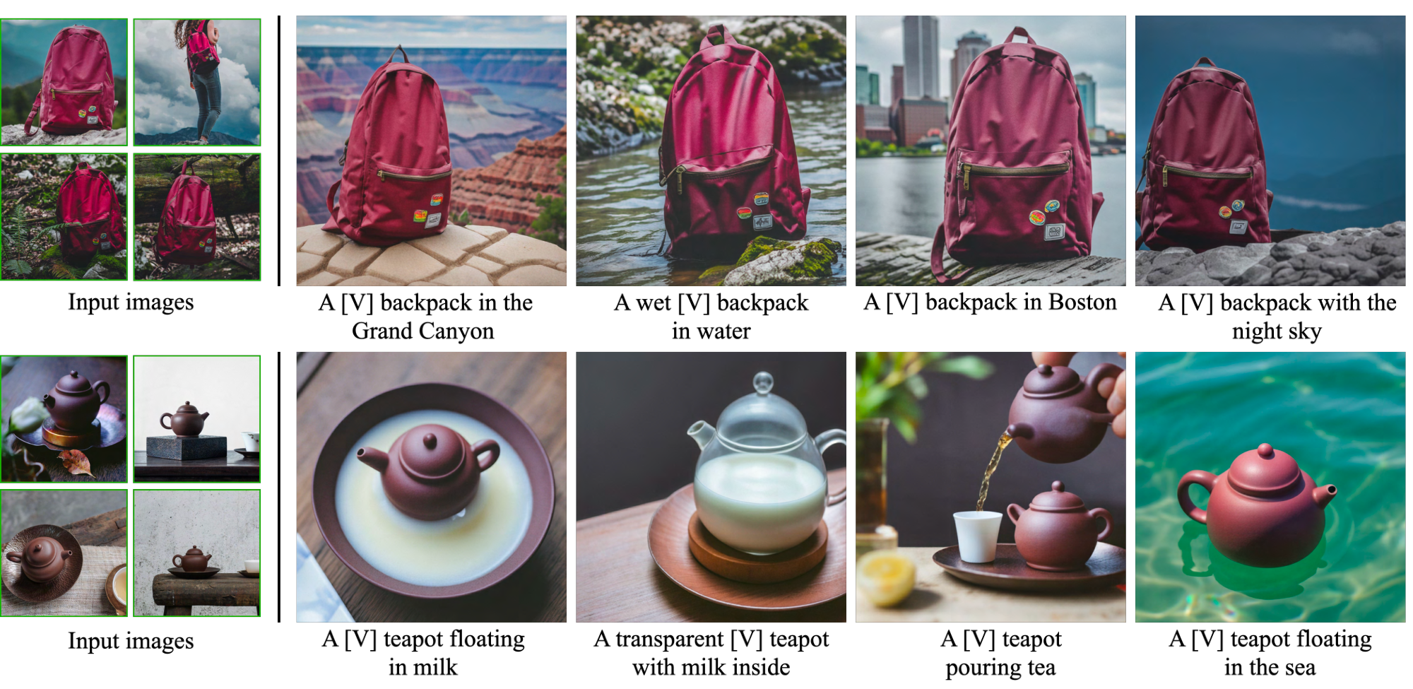 Controllable Generative Models. There are various approaches to control generative models, where some of them might prove to be viable directions for subject-driven prompt-guided image synthesis. Liu et al. [54] propose a diffusion-based technique allowing for image variations guided by reference image or text. To overcome subject modification, several works [55, 56] assume a user-provided mask to restrict the modified area. Inversion [57, 38, 2] can be used to preserve a subject while modifying context. Prompt-to-prompt [58] allows for local and global editing without an input mask. These methods fall short of identity-preserving novel sample generation of a subject.