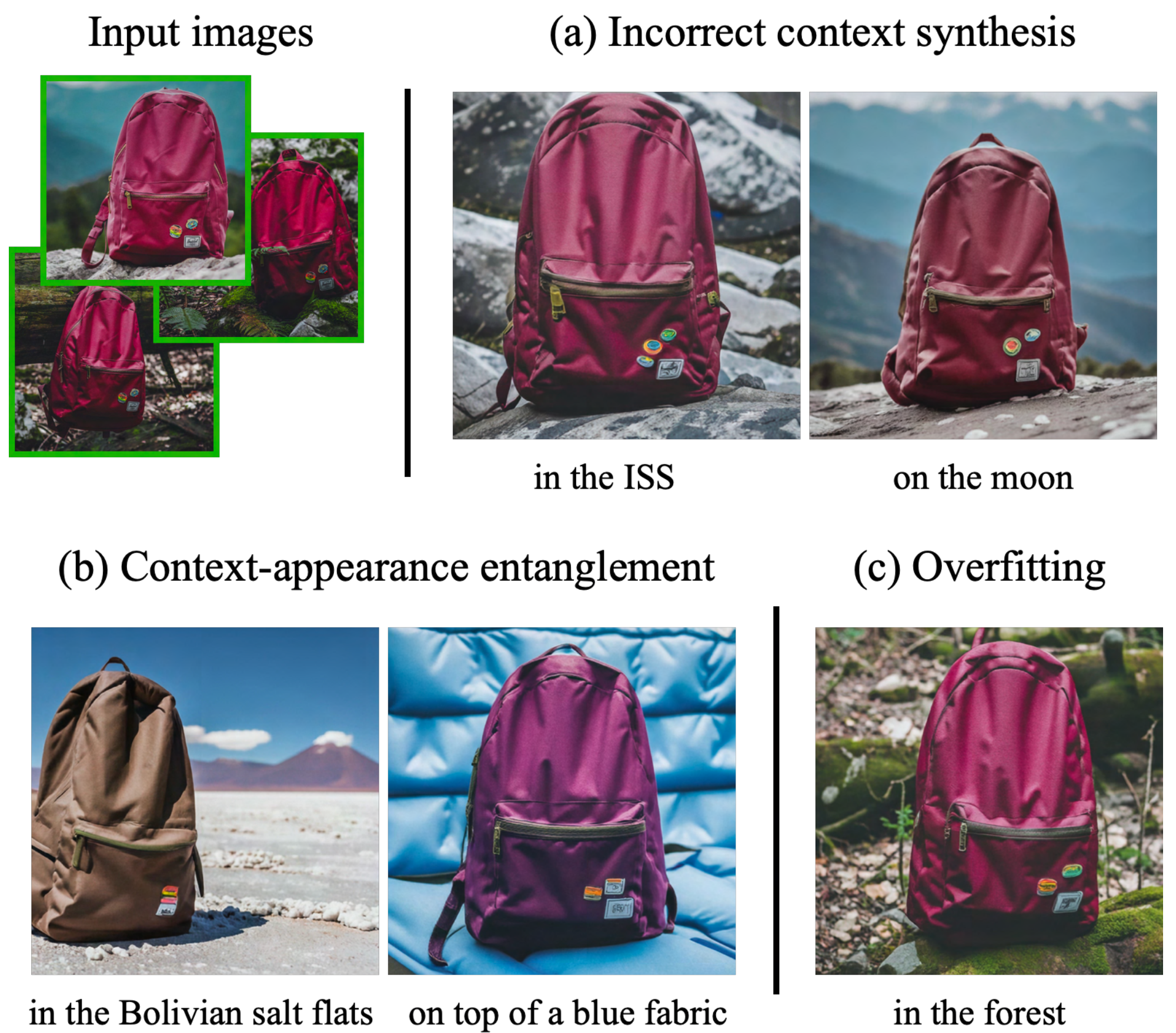 We illustrate some failure models of our method in Figure 8. The first is related to not being able to accurately generate the prompted context. Possible reasons are a weak prior for these contexts, or difficulty in generating both the subject and specified concept together due to low probability of co-occurrence in the training set. The second is context-appearance entanglement, where the appearance of the subject changes due to the prompted context, exemplified in Figure 8 with color changes of the backpack. Third, we also observe overfitting to the real images that happen when the prompt is similar to the original setting in which the subject was seen.