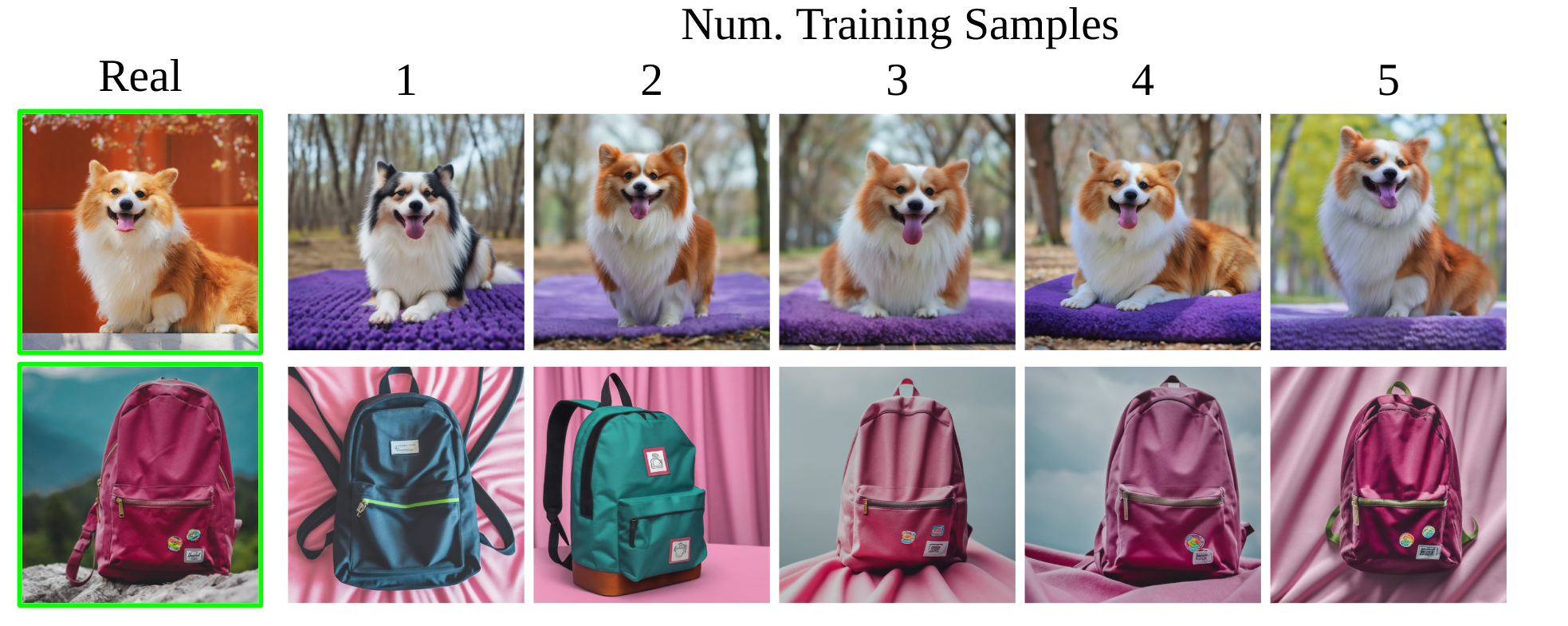 Here we run an experiment on the effects of the number of input images for model personalization. Specifically, we train models for two subjects, 5 models per subject with input images ranging from 1 to 5. We generate 4 images for 10 different recontextualization prompts for each subject. We present qualitative results in Figure 19. We can observe that for some subjects that are more common, and lie more strongly in the distribution of the diffusion model, such as the selected Corgi dog, we are able to accurately capture the appearance using only two images - and sometimes only one, given careful hyperparameter choice. For objects that are more rare, such as the selected backpack, we need more samples to accurately preserve the subject and to recontextualize it to diverse settings. Our quantitative results support these conclusions - we present the DINO subject fidelity metric in Table 5 and the CLIP-T prompt fidelity metric in Table 6. For both subjects we see that the optimal amount of input images for subject and prompt is 4. This number can vary depending on the subject and we settle on 3-5 images for model personalization.