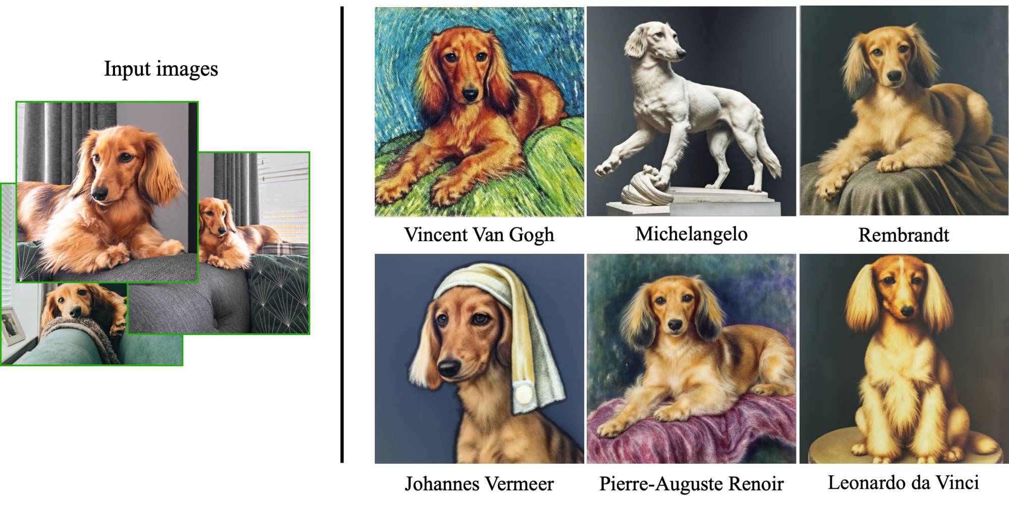 Given a prompt "a painting of a [V] [class noun] in the style of [famous painter]" or "a statue of a [V] [class noun] in the style of [famous sculptor]" we are able to generate artistic renditions of our subject. Unlike style transfer, where the source structure is preserved and only the style is transferred, we are able to generate meaningful, novel variations depending on the artistic style, while preserving subject identity. E.g, as shown in Figure 7, "Michelangelo", we generated a pose that is novel and not seen in the input images.