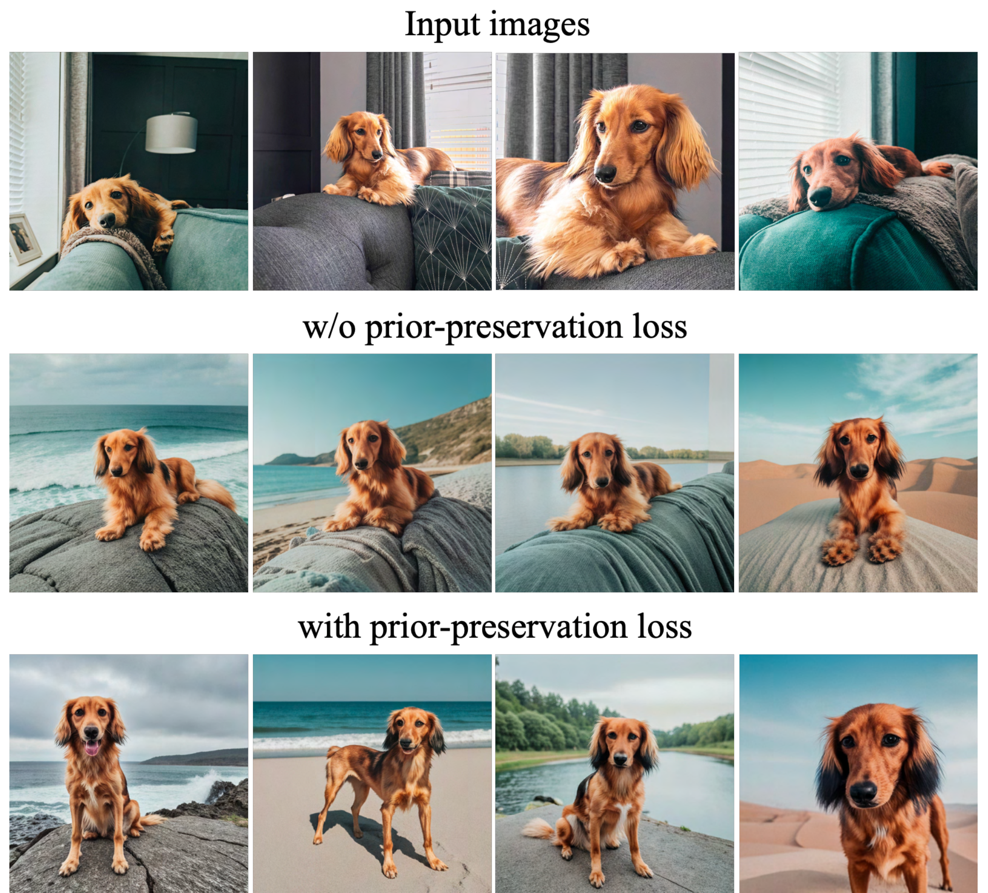 We fine-tune Imagen on 15 subjects from our dataset, with and without our proposed prior preservation loss (PPL). The prior preservation loss seeks to combat language drift and preserve the prior. We compute a prior preservation metric (PRES) by computing the average pairwise DINO embeddings between generated images of random subjects of the prior class and real images of our specific subject. The higher this metric, the more similar random subjects of the class are to our specific subject, indicating collapse of the prior. We report results in Table 3 and observe that PPL substantially counteracts language drift and helps retain the ability to generate diverse images of the prior class. Additionally, we compute a diversity metric (DIV) using the average LPIPS [71] cosine similarity between generated images of same subject with same prompt. We observe that our model trained with PPL achieves higher diversity (with slightly diminished subject fidelity), which can also be observed qualitatively in Figure 5, where our model trained with PPL overfits less to the environment of the reference images and can generate the dog in more diverse poses and articulations.