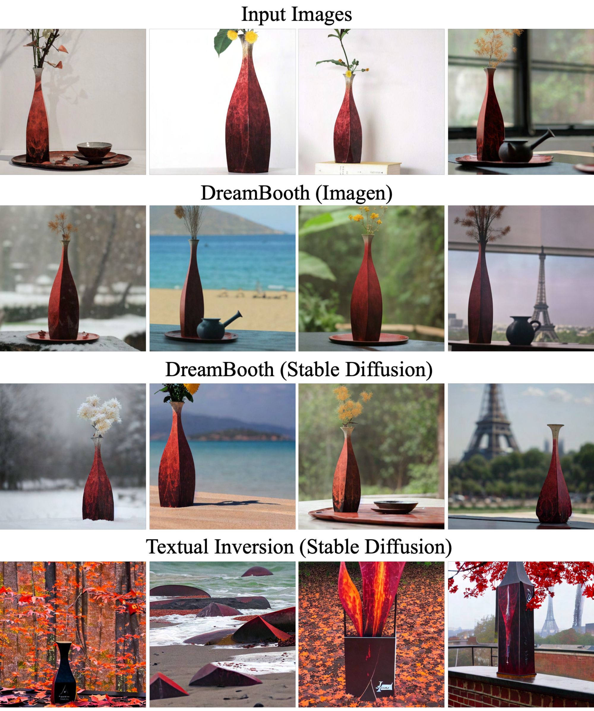We compare our results with Textual Inversion, the recent concurrent work of Gal et al. [62], using the hyperparameters provided in their work. We find that this work is the only comparable work in the literature that is subject-driven, text-guided and generates novel images. We generate images for DreamBooth using Imagen, DreamBooth using Stable Diffusion and Textual Inversion using Stable Diffusion. We compute DINO and CLIP-I subject fidelity metrics and the CLIP-T prompt fidelity metric. In Table 1 we show sizeable gaps in both subject and prompt fidelity metrics for DreamBooth over Textual Inversion. We find that DreamBooth (Imagen) achieves higher scores for both subject and prompt fidelity than DreamBooth (Stable Diffusion), approaching the upper-bound of subject fidelity for real images. We believe that this is due to the larger expressive power and higher output quality of Imagen.