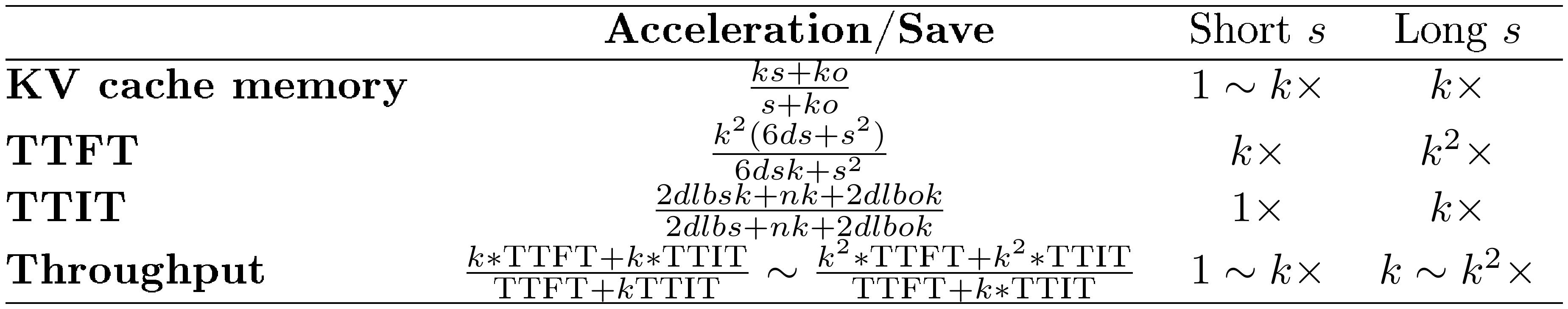 We denote the following parameters: $s$ as the context length, $o$ as the output length, $b$ as the batch size, $d$ as the dimensionality of the hidden states, $l$ as the number of layers in the decoder, and $n$ as the number of model parameters. The flop rate of the GPU is $f$, and the high bandwidth memory of the GPU is $m$ and we use the compression rate of $k$ in our encoder. We assume that all our chunk embeddings are precomputed and cached. The model is loaded with bfloat16 precision. We focus our analysis on LLaMA-2-7B model. The results should be generalizable to other models. We use the following metrics: TTFT which is the latency for the system to generate the first token; TTIT which is the time that it takes to generate iterative token after the first token; Throughput which is the number of tokens that are generated from the system in a unit time. Table 6 shows that with short context length $s$ we are able to achieve $k\times$ acceleration in TTFT and up to $k\times$ acceleration in throughput. With longer context length $s$, we are able to achieve up to $k^2\times$ acceleration in both TTFT and throughput. The details on the latency and throughput calculation are in Appendix B.4.