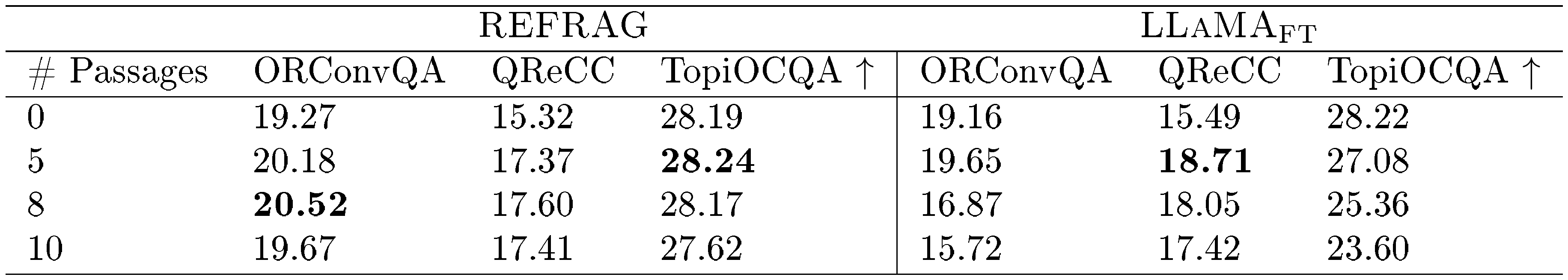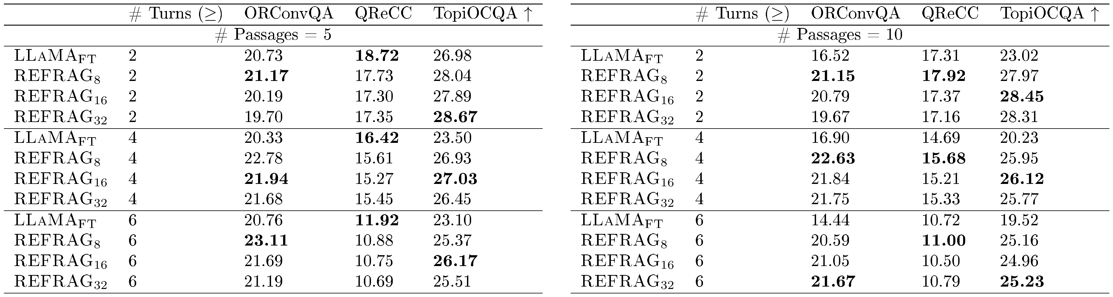 Result analysis. Table 4 presents results across varying numbers of conversational turns and retrieved passages. Our model outperforms $\textsc{LLaMA}{\text{FT}}$ on two out of three datasets in the 5-passage setting, and on all three datasets in the 10-passage setting. This improvement is attributable to the limited 4k-token context window of $\textsc{LLaMA}{\text{FT}}$, which necessitates truncating portions of the conversational history in longer contexts, resulting in the loss of crucial information required to answer subsequent questions. In contrast, our model, trained on the same $\textsc{LLaMA}$ model without extending its effective positional encoding, maintains robust performance even with a large number of passages, owing to the benefits of our compression approach. Table 5 further reports the performance of different models under varying numbers of passages, with our model consistently achieving superior results on two out of three datasets for the reasons outlined above.