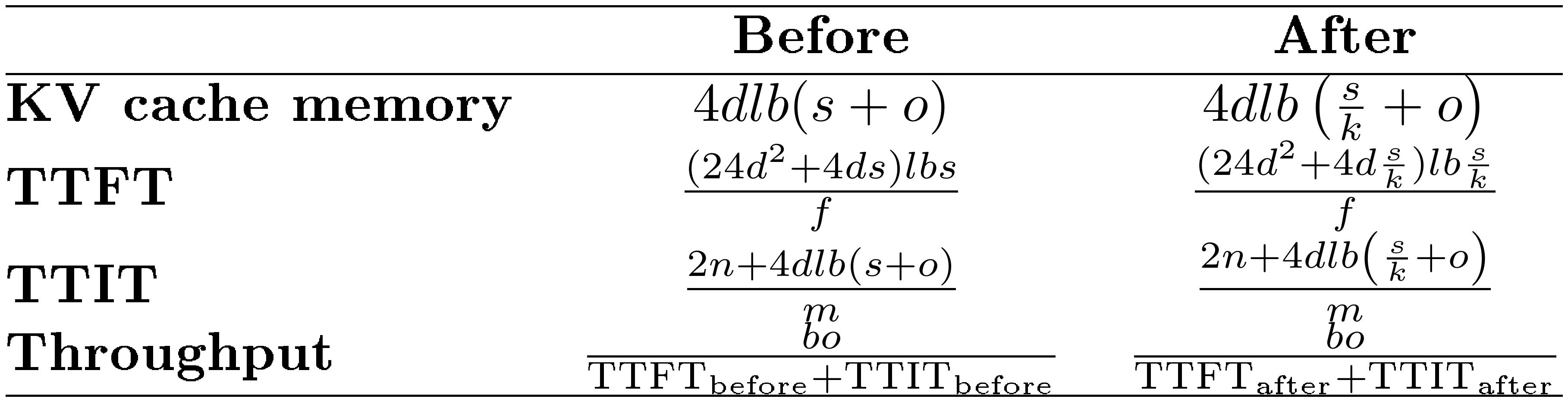 [35] first introduced the compressive transformer, which compresses the KV cache to reduce memory requirements for long-context applications. However, this approach only decreases KV cache memory usage, does not improve time-to-first-token latency, and requires training the model from scratch. [36] extended this idea by employing recursive context compression, generating a summary hidden state for each chunk to inform the next chunk’s computation. The recursive nature, however, prevents pre-computation and reuse of chunk embeddings, and does not reduce decoding latency. [37] proposed recursive compression for documents, using compressed embeddings for prediction, similar to our method. However, their sequential compression process results in high latency when the summary vector is not cached, and their approach only supports applications where the summary token is restricted to the prefix of the language model (e.g., RAG), limiting applicability. In contrast, our work is the first to enable pre-computation of chunk embeddings and their use at arbitrary positions within the prompt, supporting diverse applications such as RAG and multi-turn conversation. Furthermore, our method learns where to apply compression, allowing for adaptive compression rates at inference time without recomputing chunk embeddings.