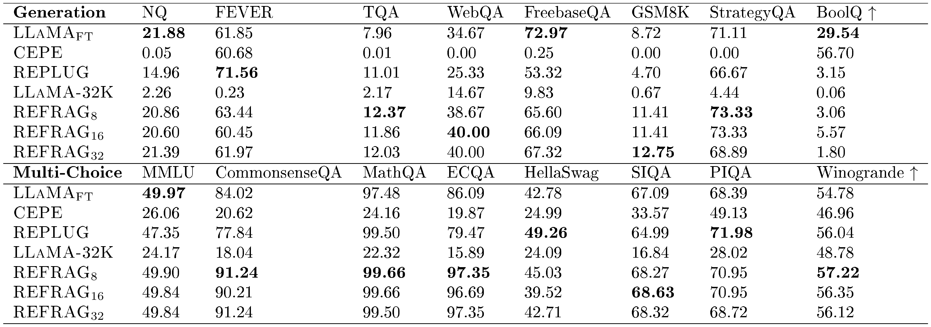Table 1 reports performance for $s=2048$ and $o \in {512, 1024, 2048}$, where, e.g., P512 denotes $o=512$. Bolded results compare baselines, excluding $\textsc{LLaMA-Full Context}$ and $\textsc{LLaMA-32K}$, which use full context without compression and are expected to perform best. Notably, $\textsc{REFRAG}8$ and $\textsc{REFRAG}{16}$ consistently outperform other baselines across nearly all settings, while also achieving lower latency than CEPE (Figure 2). For reference, ${\textsc{LLaMA}}_{256}$ uses only the last 256 tokens, matching the number of chunk embeddings in $\textsc{REFRAG}_8$ ($s/k=256$), yet $\textsc{REFRAG}8$ consistently surpasses $\textsc{LLaMA}{256}$, demonstrating the effectiveness of compressed chunk embeddings.