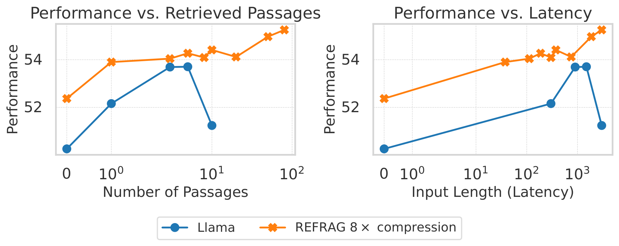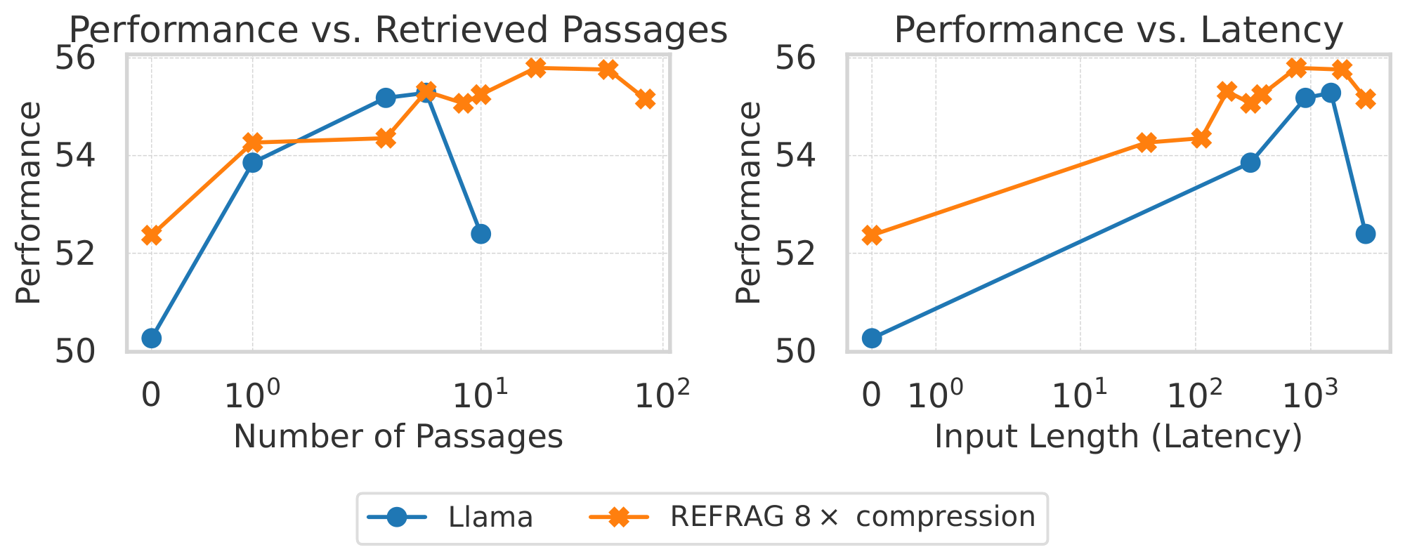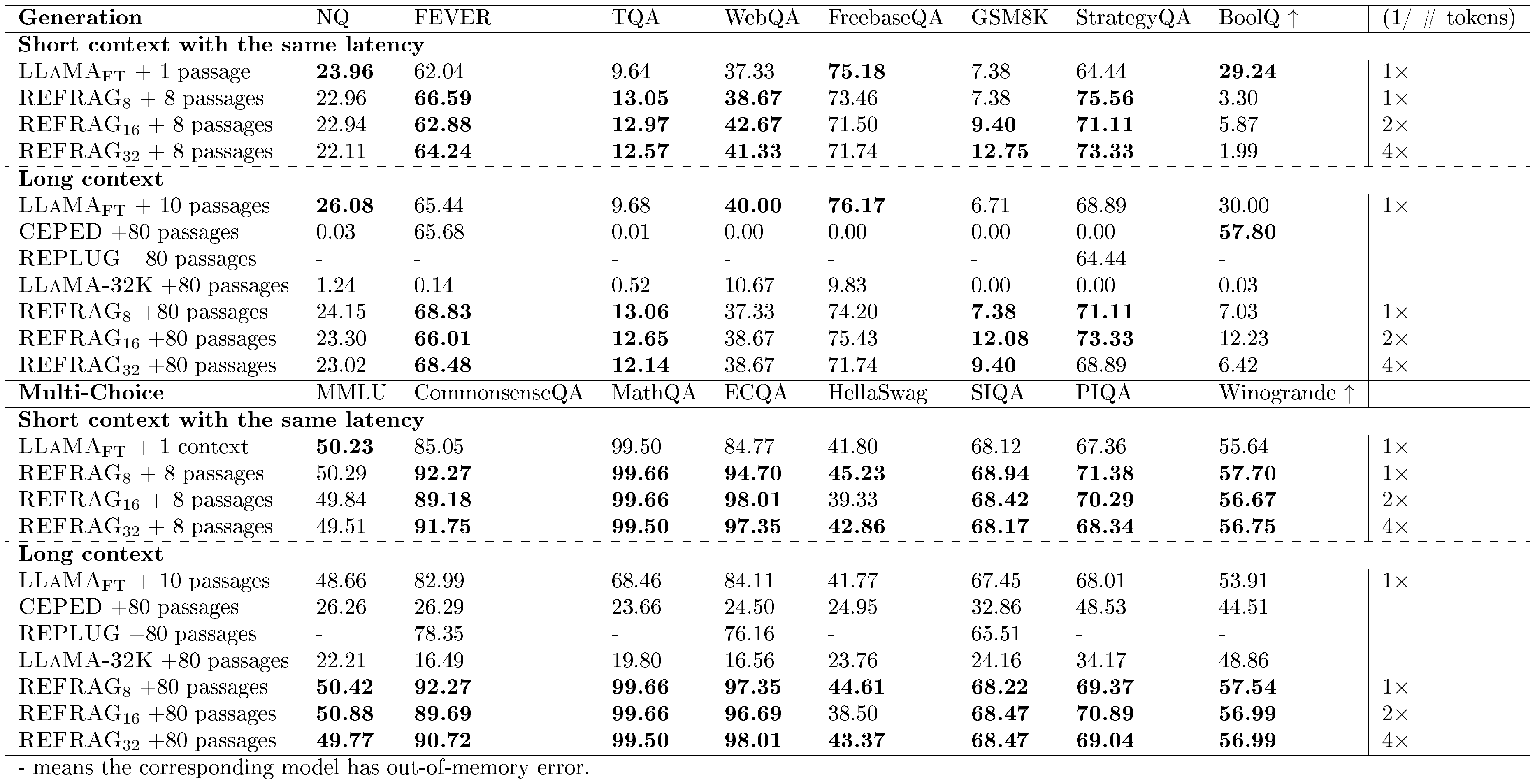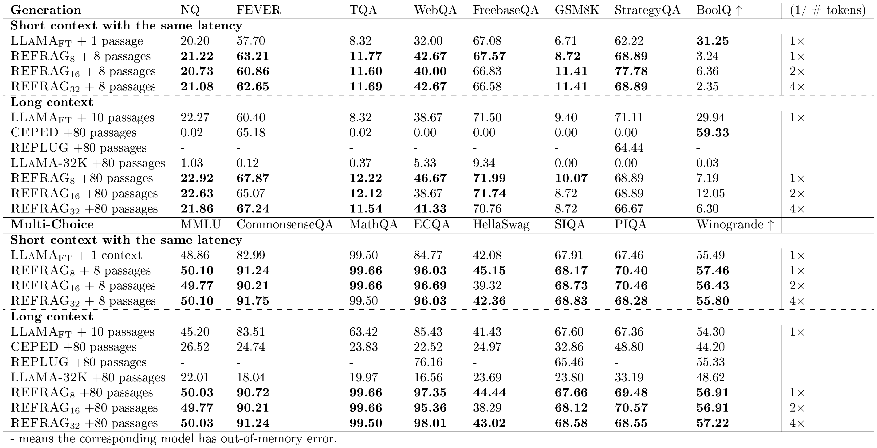 Result analysis. Table 3 shows the performance of different baselines under short and long contexts (i.e., varying number of retrieved passages)[^3]. (1/# tokens) is inverse for the number of tokens in the decoder model. This is used as a metric to gauge the latency of the model (the higher, the lower latency). $\textsc{LLaMA}{\text{FT}}$ is the original LLaMA-2-7B model that is fine-tuned on the same RAG dataset used to train our model. We compare the performance under both the short context and the long context scenarios. For the short context, we use 1 passage for $\textsc{LLaMA}{\text{FT}}$ and use 8 passages for all our models. The baseline of $\textsc{REFRAG}8$ will have the same latency as the $\textsc{LLaMA}{\text{FT}}$ model. However, due to the compression, we are able to have more context information and hence achieve better performance. Surprisingly, $\textsc{REFRAG}{16}$ and $\textsc{REFRAG}{32}$ both outperform the $\textsc{LLaMA}_{\text{FT}}$ model despite having $2\times$ and $4\times$ fewer tokens in the decoder (i.e., lower latency). The same result occurs in long context scenarios. Our model has even higher performance gains in multi-choice tasks. Table 15 shows the performance of our model under different numbers of passages. The result suggests that most tasks still benefit from more passages in our model. Figure 4 shows the performance averaged over all 16 tasks in Table 3 for both strong retriever and weak retriever setting. The result demonstrates that under the same number of retrieved passages, we are able to match the performance of LLaMA in the strong retriever setting and even outperform LLaMA under the weak retriever setting. This is because our model enables larger context and hence enables extract more useful information when the retrieved passages are less relevant. Under equivalent latency constraints, $\textsc{REFRAG}$ consistently outperform LLaMA on both settings as the saved context can be reinvested to include additional information within the same latency budget.
