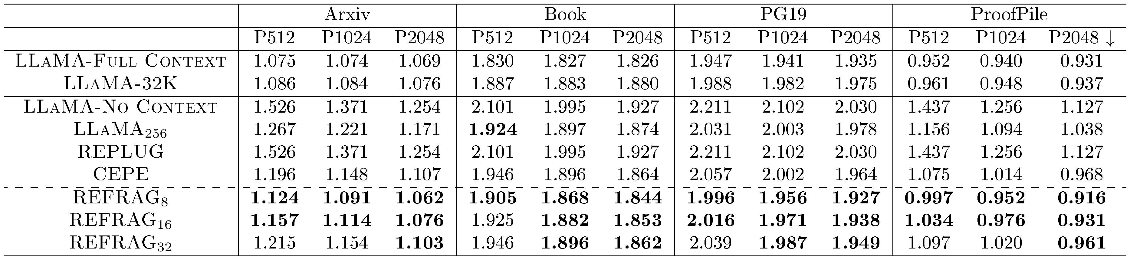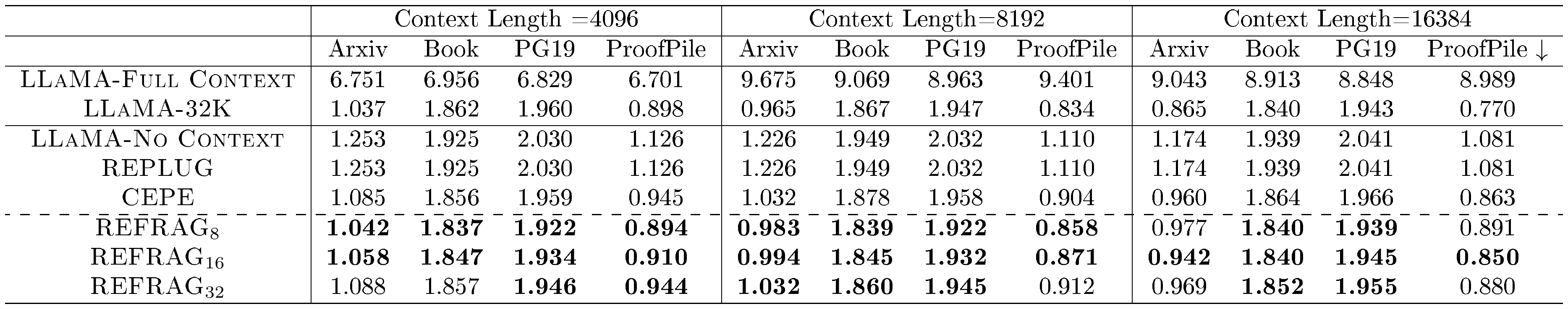 Baselines. All baseline models are based on LLaMA-2-7B ([11]), unless otherwise specified, to ensure fair comparison with prior work ([5, 16]). Each data point contains $T=4096$ tokens, split into $s=2048$ context and $o=2048$ output tokens. We evaluate perplexity on $x_{s+1:s+o}$. Below, we briefly describe the main baselines; further details are provided in Appendix B. $\textsc{LLaMA-No Context}$: LLaMA-2-7B evaluated on $x_{s+1:s+o}$ with only output tokens as input. $\textsc{LLaMA-Full Context}$: LLaMA-2-7B evaluated on $x_{s+1:s+o}$ with the full sequence $x_{1:T}$ as input. $\textsc{CEPE}$: Memory-efficient long-context model ([5]) a previous SOTA model which share some similarity to $\textsc{REFRAG}$ $\textsc{CEPED}$ denotes its instruction-tuned variant. $\textsc{LLaMA-32K}$: LLaMA-2-7B fine-tuned for 32K context length. $\textsc{REPLUG}$: Retrieval-augmented LLaMA-2-7B ([16]). $\textsc{REFRAG}$: Our approach (see Figure 1); $\textsc{REFRAG}k$ denotes compression rate $k$, $\textsc{REFRAG}$ ${\text{RL}}$ uses RL-based selective compression. $\textsc{LLaMA}_{K}$: LLaMA-2-7B evaluated on $x_{s+1:s+o}$ with the truncated sequence $x_{s-K:T}$ as input to match the token count of $\textsc{REFRAG}$.