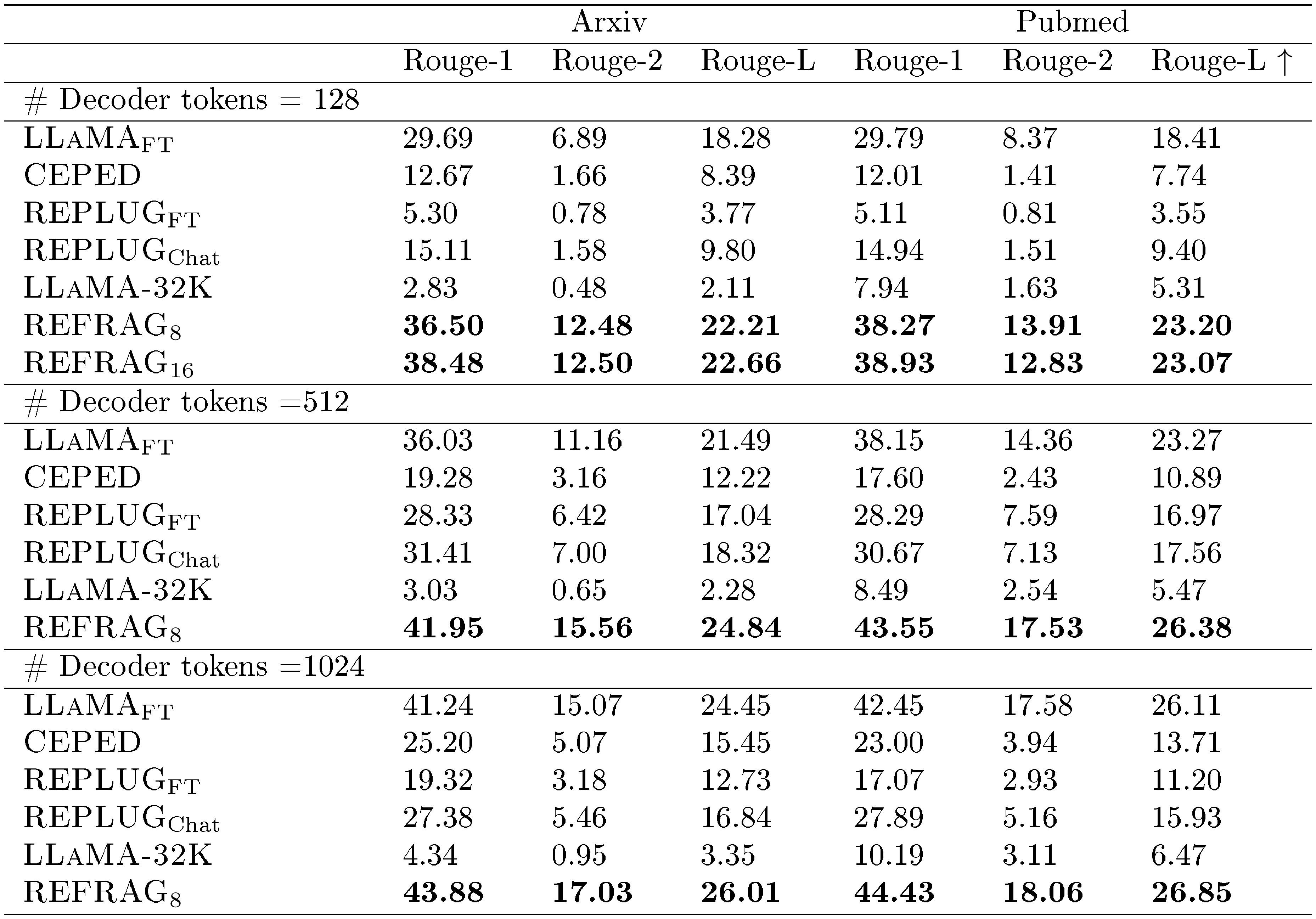 We fine-tune our model on the long document summarization dataset ([47]). This dataset contains long scientific articles from Arxiv and Pubmed, and the task is to generate the abstract given the entire article. This application is challenging due to the long-context nature of the task. We fine-tune the $\textsc{REFRAG}$ and $\textsc{LLaMA}$ models on these two datasets and report the performance on the validation set. The summarization task provides an ideal condition to inspect whether it is beneficial to bring more information with compressed representation or less information without compression, since correct summarization requires complete information from the whole document.