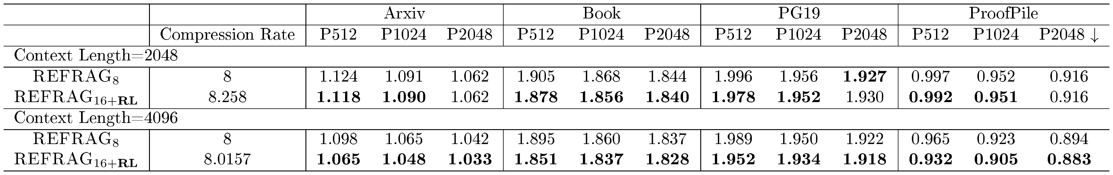 Advantages of RL-based selective compression. Figure 3 under various compression rates, achieved by varying the number of chunks to compress (i.e., adjusting $p$). Notably, a compression rate of $8$ can be obtained either by configuring $\textsc{REFRAG}{16}$ to compress the appropriate number of chunks, or by employing $\textsc{REFRAG}{8}$ with full compression, which is natively trained at a compression rate of $8$. This raises a natural question: does the former approach outperform the latter? Table 13 demonstrates that $\textsc{REFRAG}{16}$ with RL-based selective compression consistently outperforms $\textsc{REFRAG}{8}$ across different datasets and context lengths. This finding is particularly surprising, as $\textsc{REFRAG}{16}$ achieves a compression rate of $8$ without recomputing chunk embeddings, yet still surpasses the performance of $\textsc{REFRAG}{8}$. These results further highlight the effectiveness of the RL-trained policy and underscore the practicality of dynamically adjusting the compression rate without compromising performance.