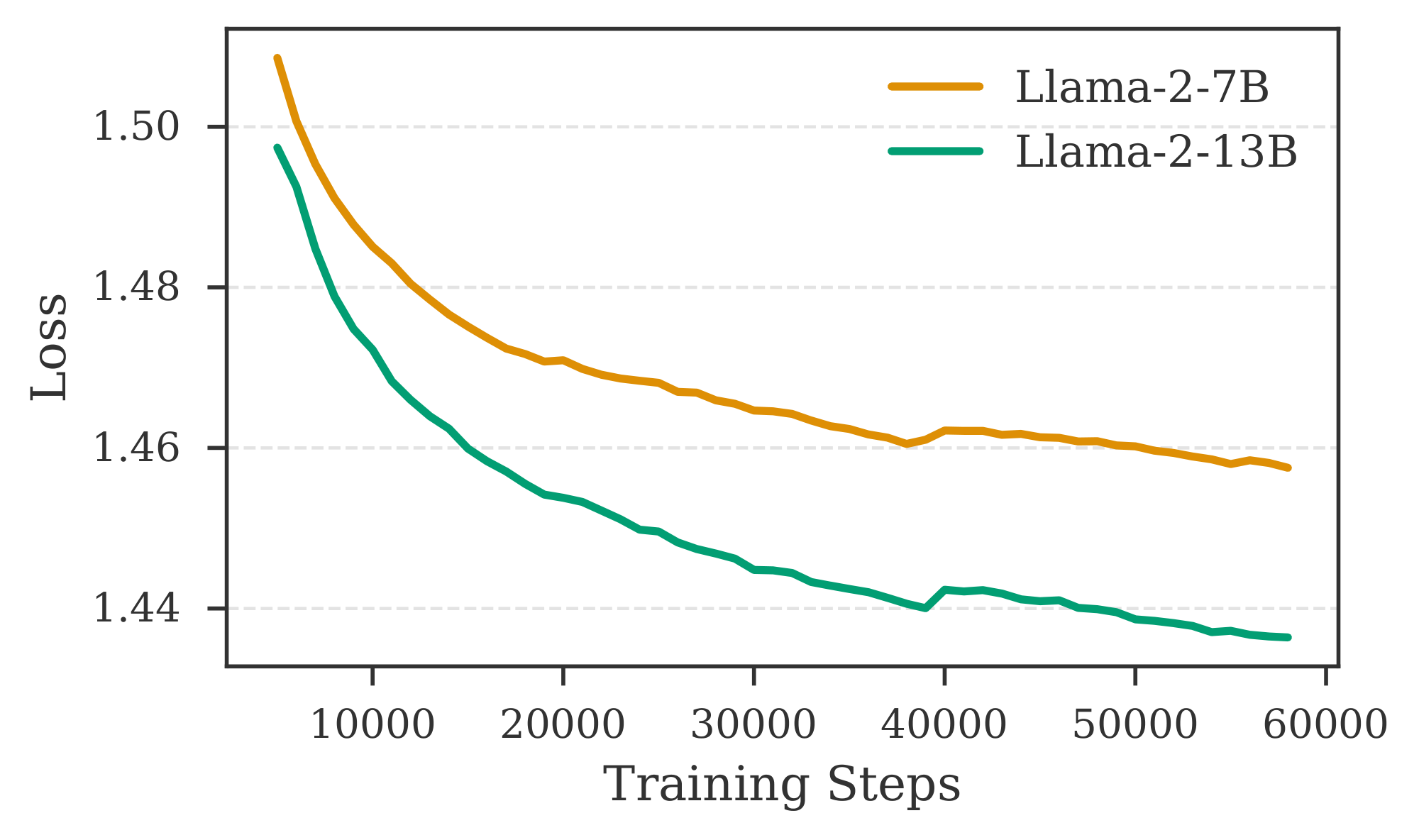 Different combinations of encoder and decoder models for $\textsc{REFRAG}$. We employ LLaMA-2-7B and LLaMA-2-13B as decoders, and RoBERTa-Base and RoBERTa-Large as encoders, to investigate how model performance varies with different encoder and decoder sizes. Figure 14 presents results for various encoder-decoder combinations. We observe that increasing the number of parameters in the decoder leads to a substantial reduction in loss, whereas enlarging the encoder yields only a modest improvement. This discrepancy may be attributed to the relatively minor increase in size from RoBERTa-Base to RoBERTa-Large compared to the substantial jump from 7B to 13B in the decoder. Additional results in Figure 18 indicate that a larger encoder may not always be advantageous when training with limited data in the continual pre-training setting. This observation aligns with previous findings by [17], which demonstrate that larger encoders in multi-modal models can negatively impact performance when data is scarce. To further validate our training approach on other decoder models, we conduct experiments with LLaMA-3.1-8B and LLaMA-3.2-3B. Table 14 reports the performance of these models paired with RoBERTa-Base and RoBERTa-Large encoders on the Arxiv domain. Models trained with our recipe achieve performance comparable to the Full Context setting (i.e., without context compression). Moreover, increasing the context length continues to benefit our model, as evidenced by lower perplexity for a context length of $4096$ compared to $2048$.