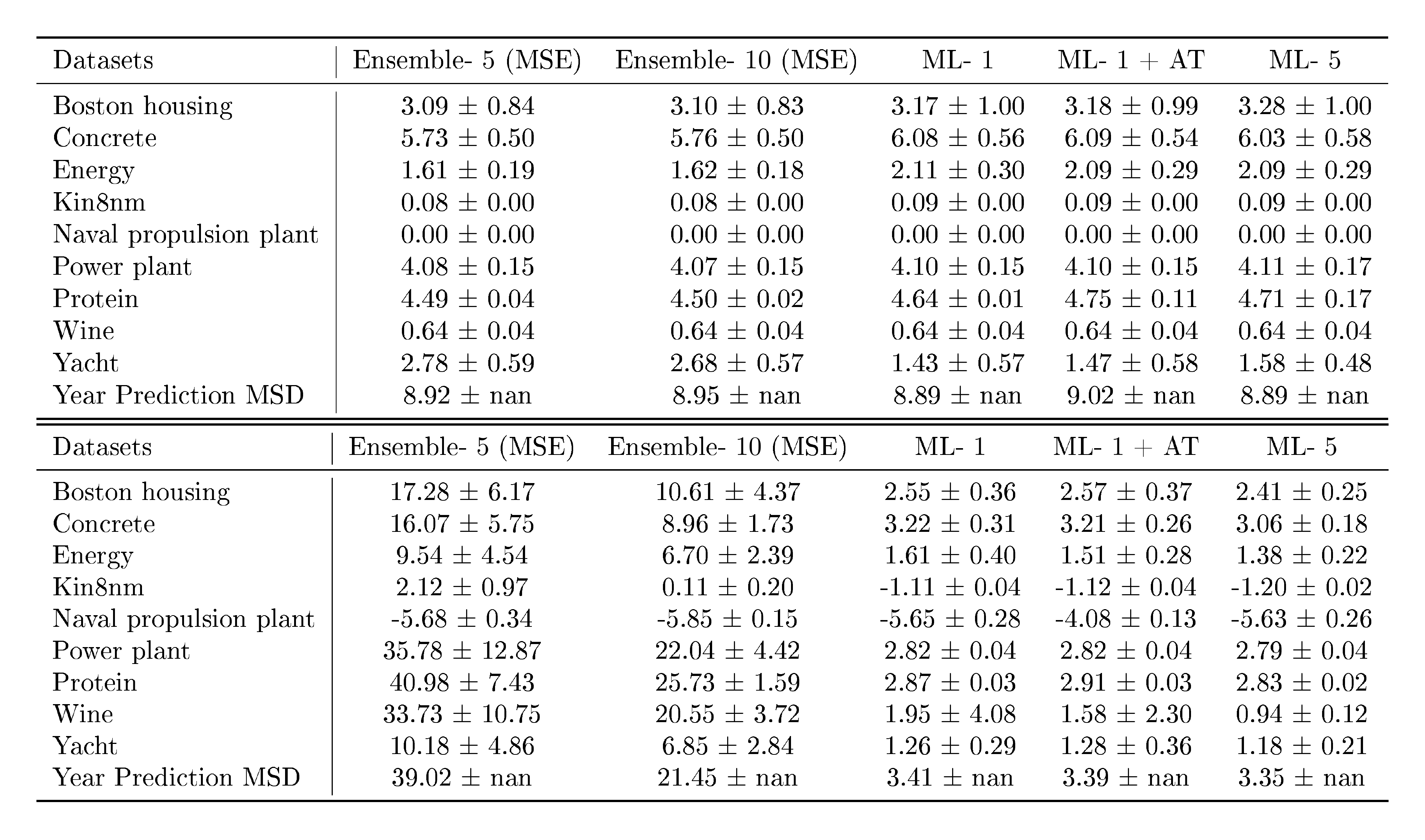 Table 2: Additional results on regression benchmark datasets: the top table reports RMSE and bottom table reports NLL. Ensemble- $M$ (MSE) denotes ensemble of $M$ networks trained to minimize mean squared error (MSE); the predicted variance is the empirical variance of the individual networks' predictions. ML- $1$ denotes maximum likelihood with a single network trained to predict the mean and variance as described in Section 2.2.1 . ML- $1$ is significantly better than Ensemble-5 (MSE) as well as Ensemble- $10$ (MSE), clearly demonstrating the effect of learning variance. ML- $1$ +AT denotes additional effect of adversarial training (AT); AT does not significantly help on these benchmarks. ML- $5$, referred to as deep ensembles in Table 1, is an ensemble of $5$ networks trained to predict mean and variance. ML- $5$ +AT results are very similar to ML- $5$ (the error bars overlap), hence we do not report them here.