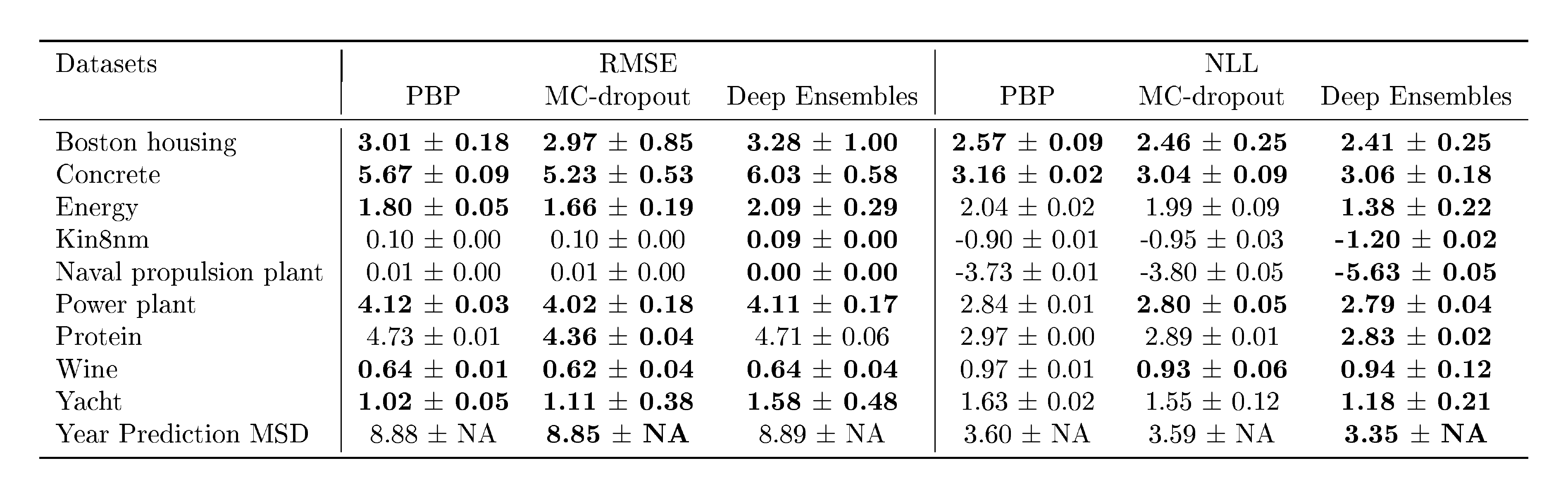 [^6]: We do not compare to VI ([16]) as PBP and MC-dropout outperform VI on these benchmarks.