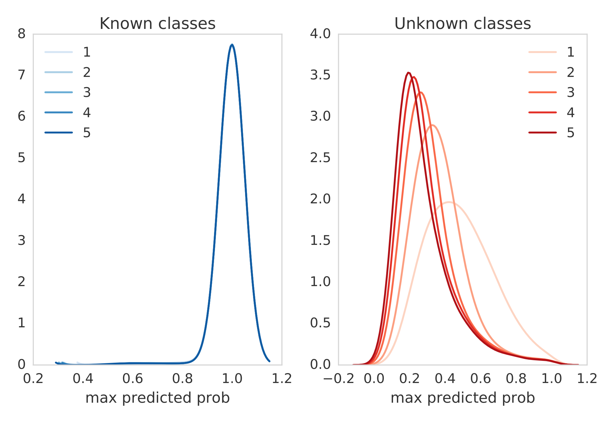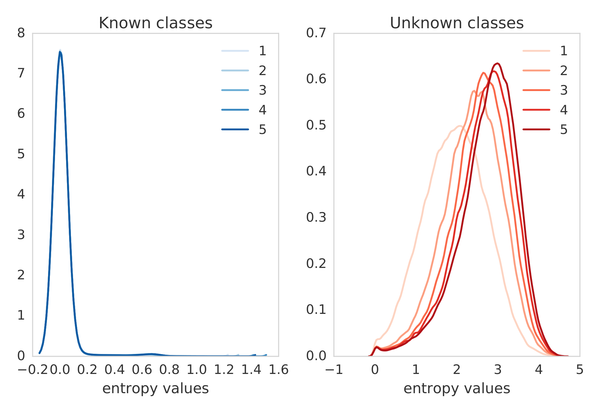 Finally, we test on ImageNet by splitting the training set by categories. We split the dataset into images of dogs (known classes) and non-dogs (unknown classes), following [49] who proposed this setup for a different task. Figure 5 shows the histogram of the predictive entropy as well as the maximum predicted probability (i.e. confidence in the predicted class). We observe that the predictive uncertainty improves on unseen classes, as the ensemble size increases.