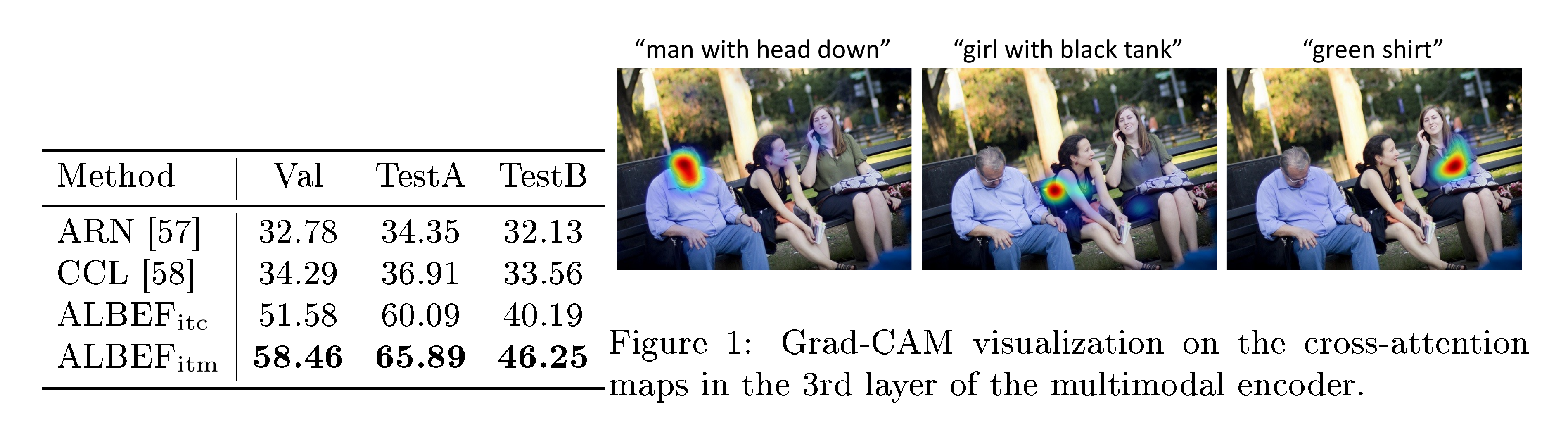 [@tab:tbl_grounding] shows the results on RefCOCO+, where ALBEF substantially outperforms existing methods [57, 58] (which use weaker text embeddings). The ALBEF$\mathrm{itc}$ variant computes Grad-CAM visualizations on the self-attention maps in the last layer of the image encoder, where the gradients are acquired by maximizing the image-text similarity $s\mathrm{itc}$. The ALBEF$\mathrm{itm}$ variant computes Grad-CAM on the cross-attention maps in the 3rd layer of the multimodal encoder (which is a layer specialized in grounding), where the gradients are acquired by maximizing the image-text matching score $s\mathrm{itm}$. Figure 4 provides a few visualizations. More analysis is in Appendix.